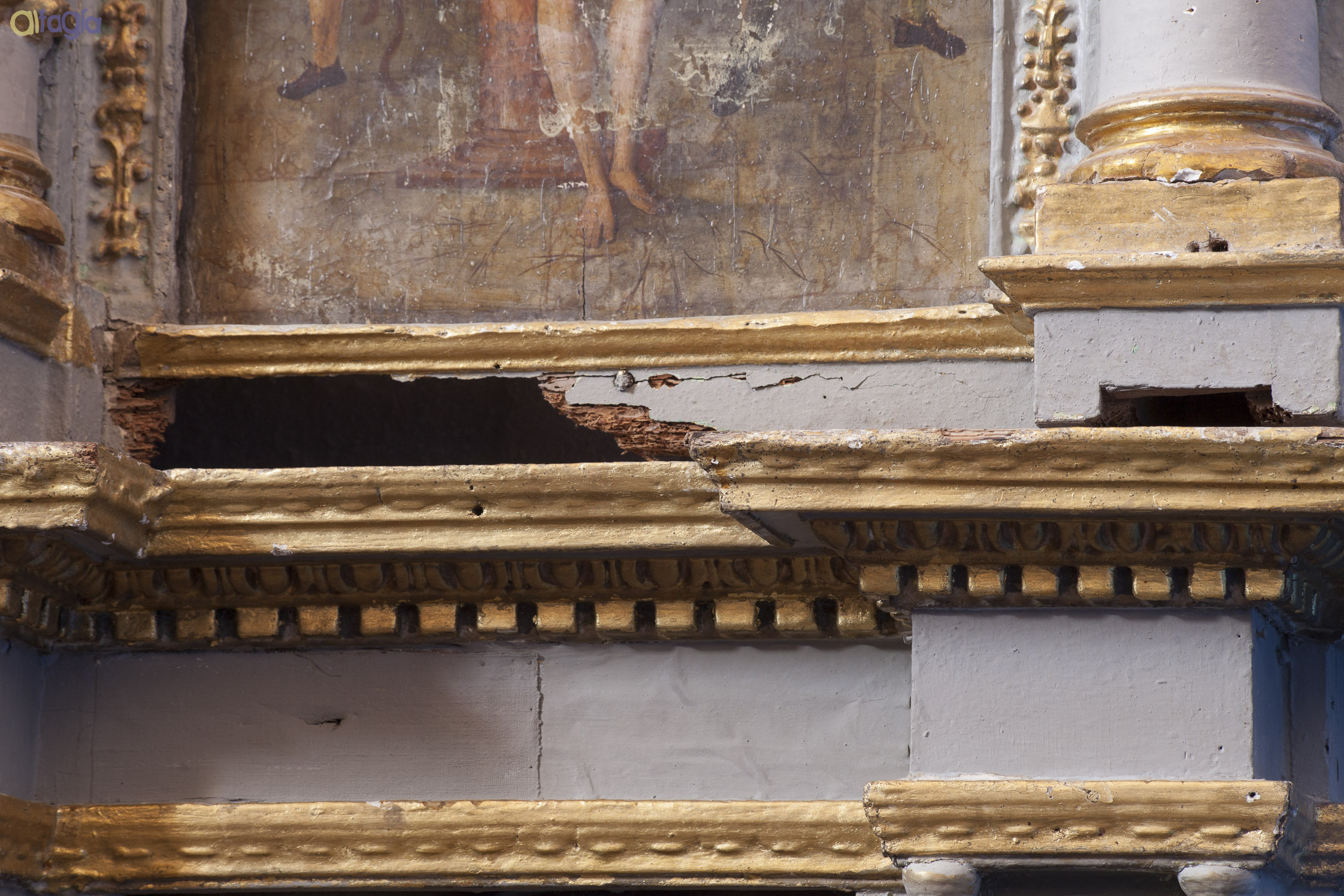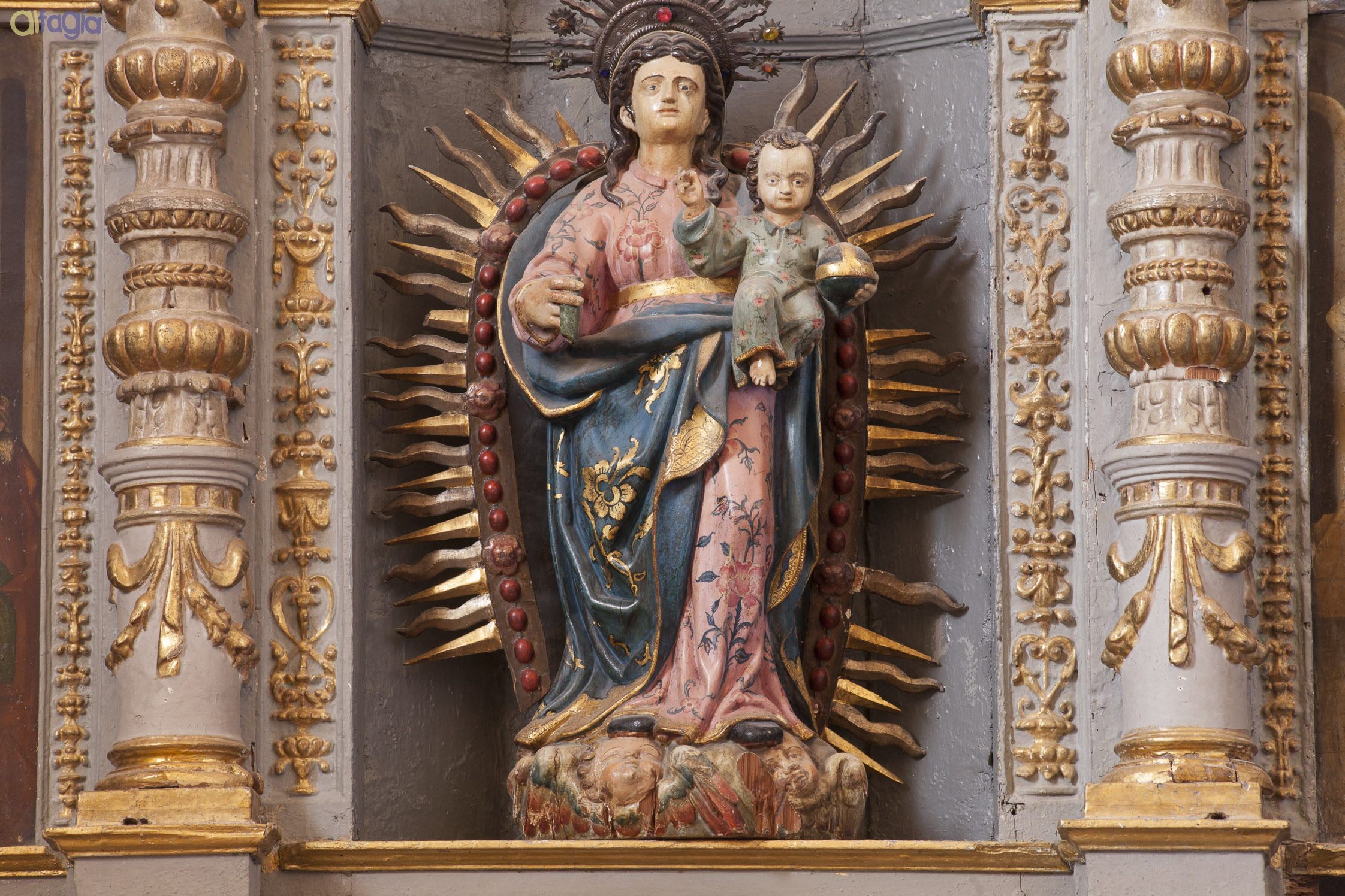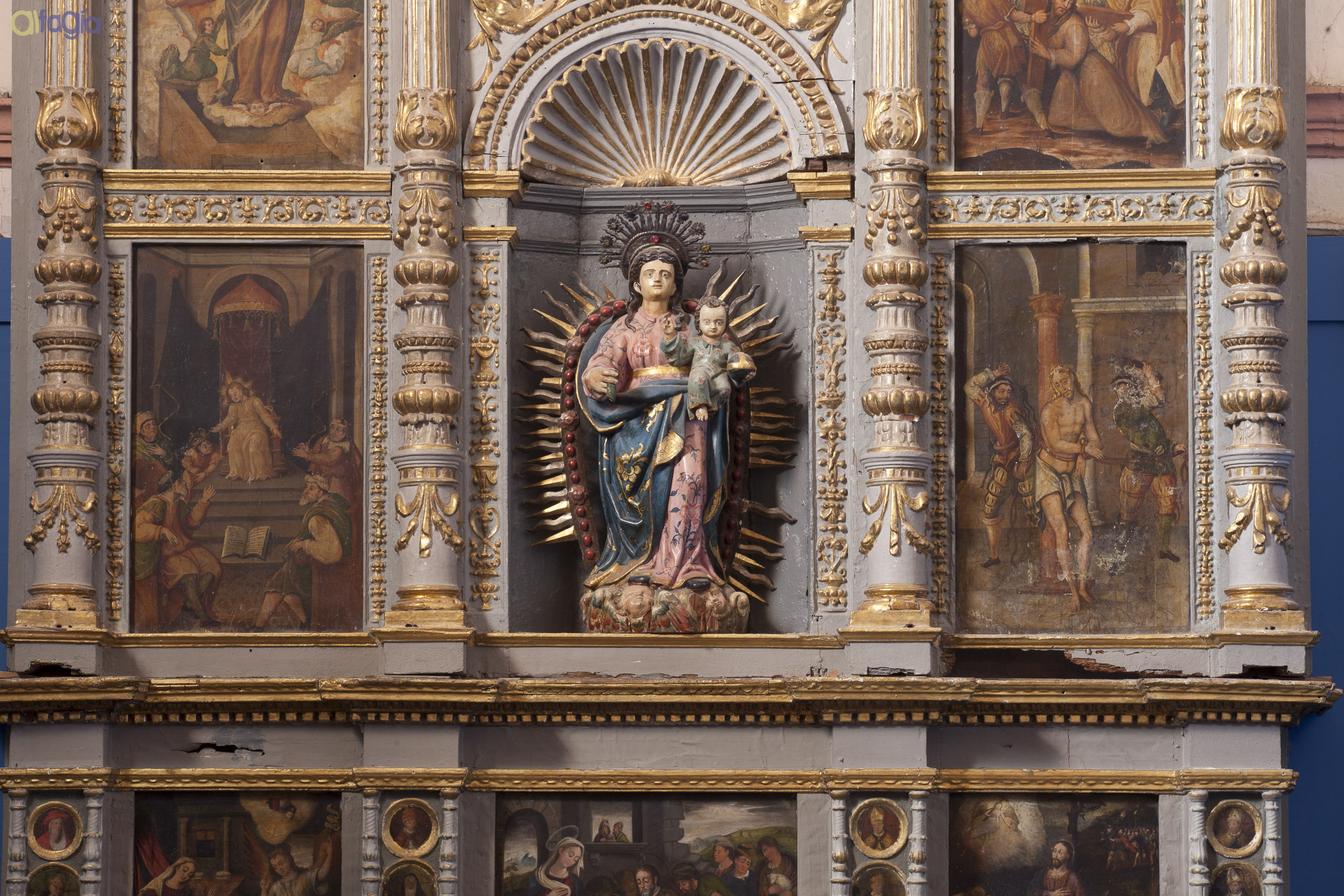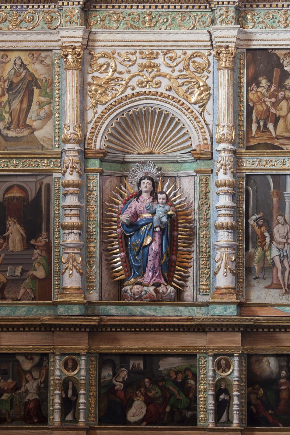 Las pinturas del cuerpo central completan los episodios relativos a la vida de Jesús junto a la Asunción de María y la talla de la imagen titular, la Virgen del Rosario. Las pinturas conservaban en su reverso el nombre manuscrito de sus títulos: La disputa en el templo del niño Jesús, El azotamiento en la columna, Llevamiento de la cruz, y Asunción de Ntra. Señora.