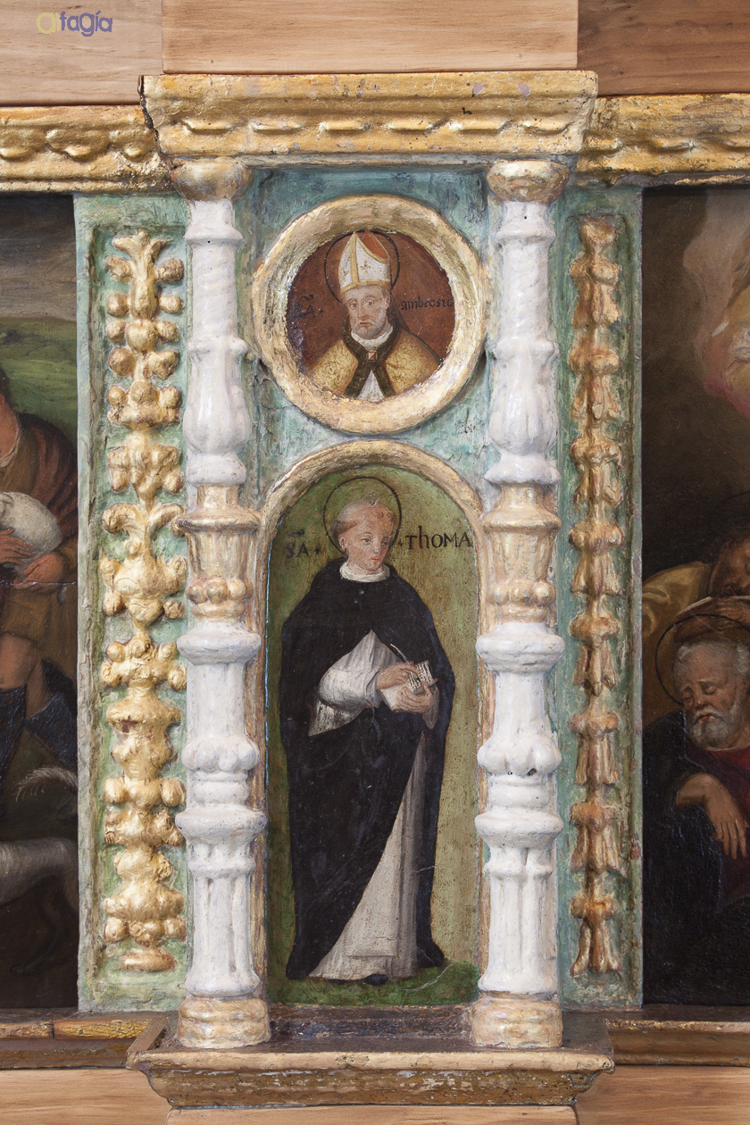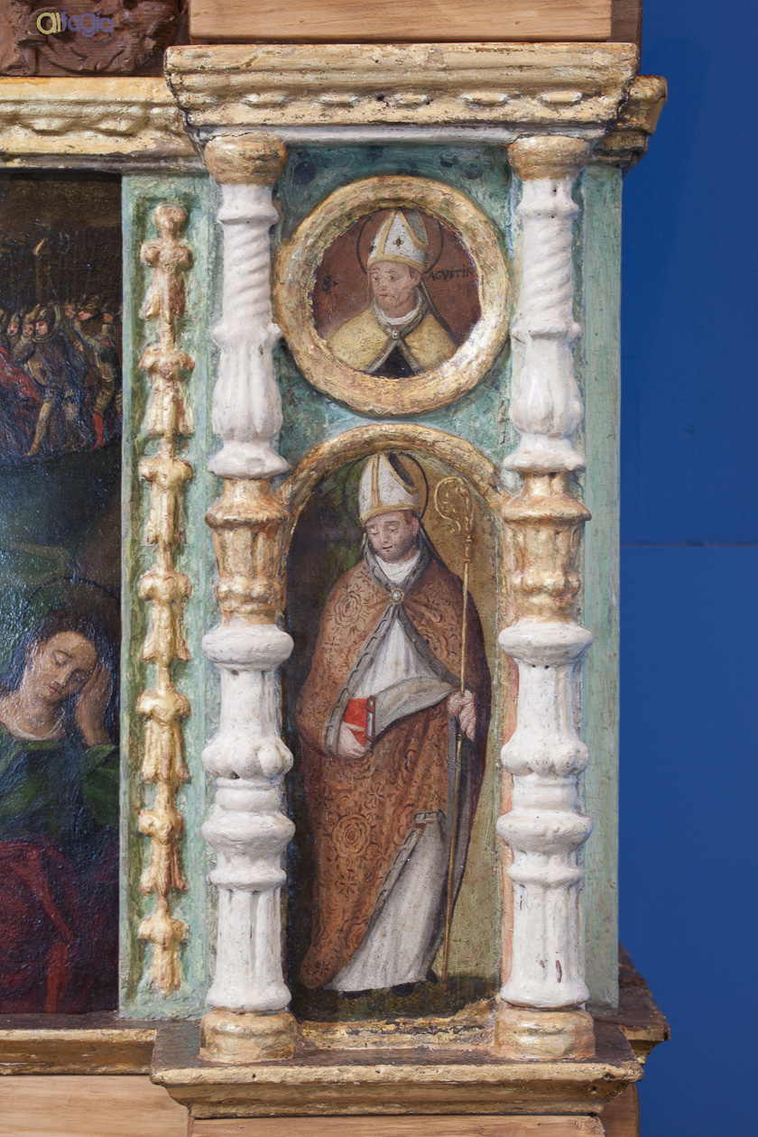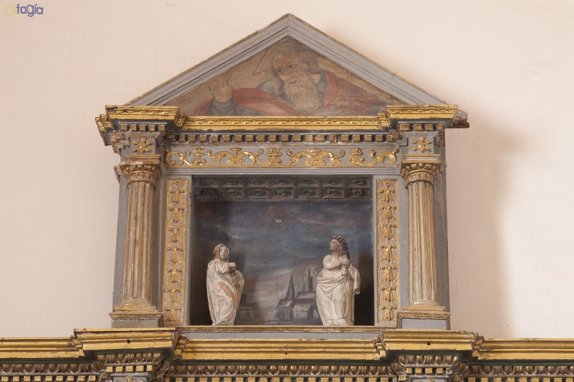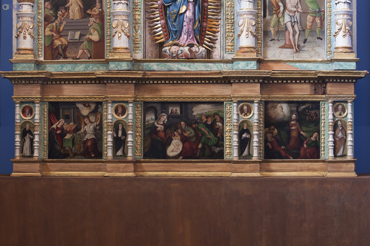 En la predela aparecen tres escenas relativas a la vida de Jesús: La Anunciación, Natividad y Oración en el huerto. Entre pilastras fusiformes aparecen encarcados en tondos los Padres de la iglesia y en la parte inferior, enmarcados a modo de exedras, cuatro Doctores de la Iglesia.