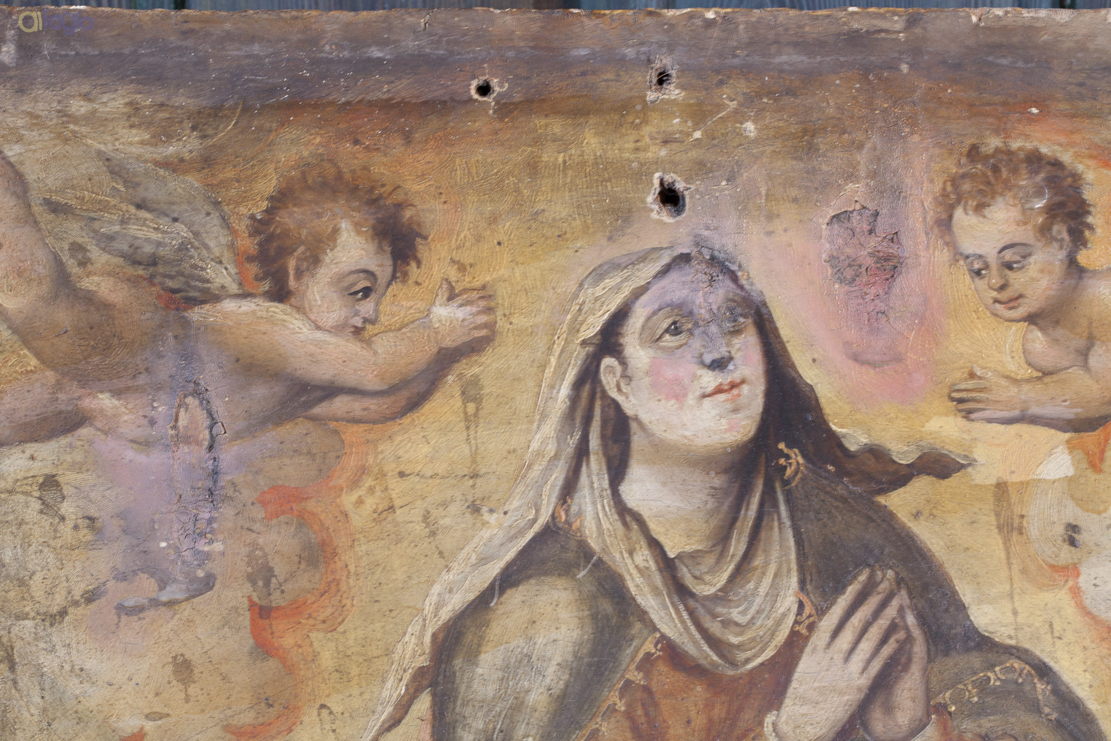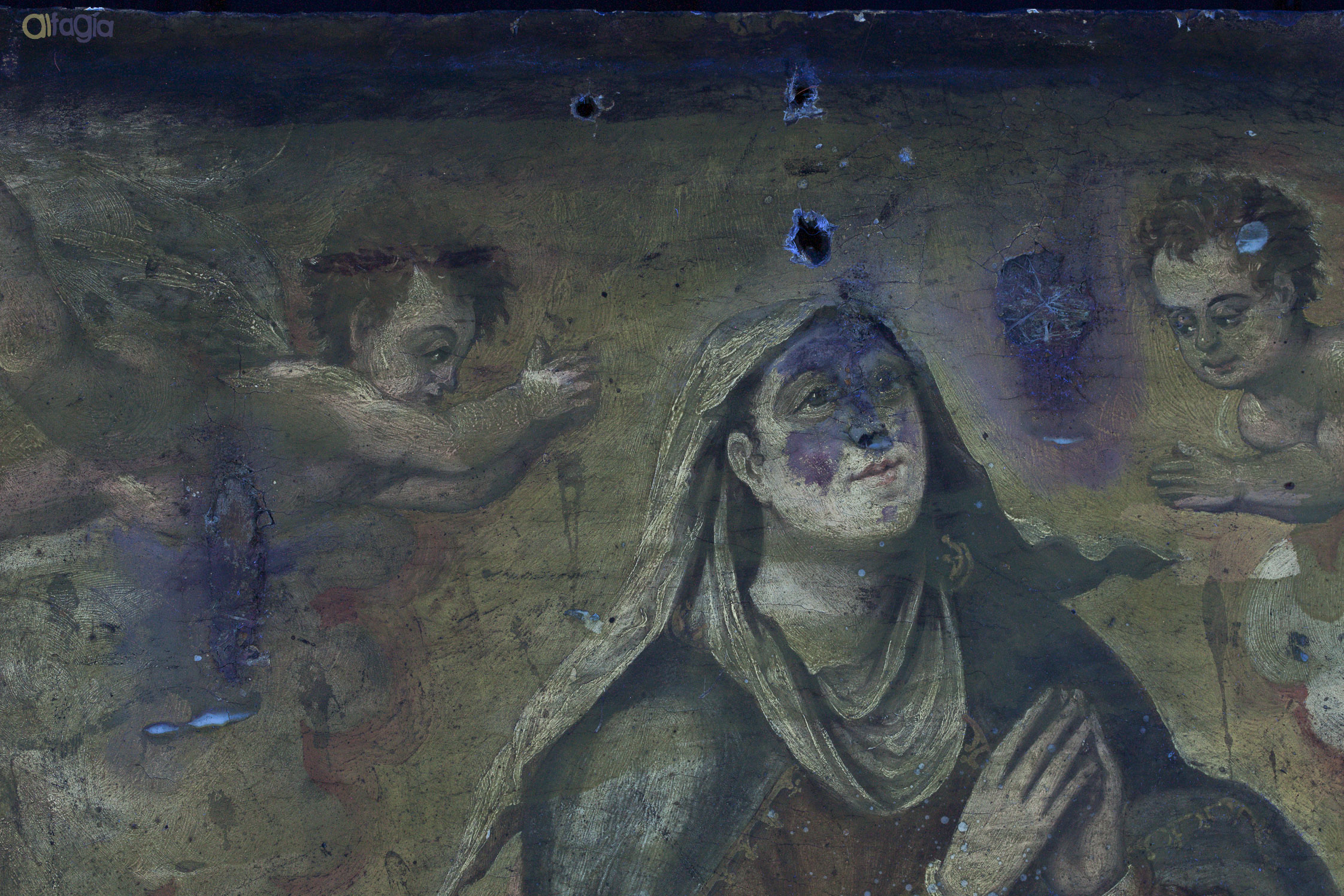 Cada una de las pinturas se sometió a un análisis visual previo al tratamiento para localizar alteraciones y definir pormenorizadamente su patología asegurando el tratamiento a aplicar. Las siguientes imágenes muestran la pintura de la Asunción de Ntra. Señora fotografíada mediante reflectografía infrarroja, empleando luz normal o luz rasante lateral, y fotografía UV durante el análisis visual previo. De la interpretación entre las analogías de las imágenes y los fenómenos de luminescencia podemos deducir la tipología de la alteración y realizar el diagnóstico.