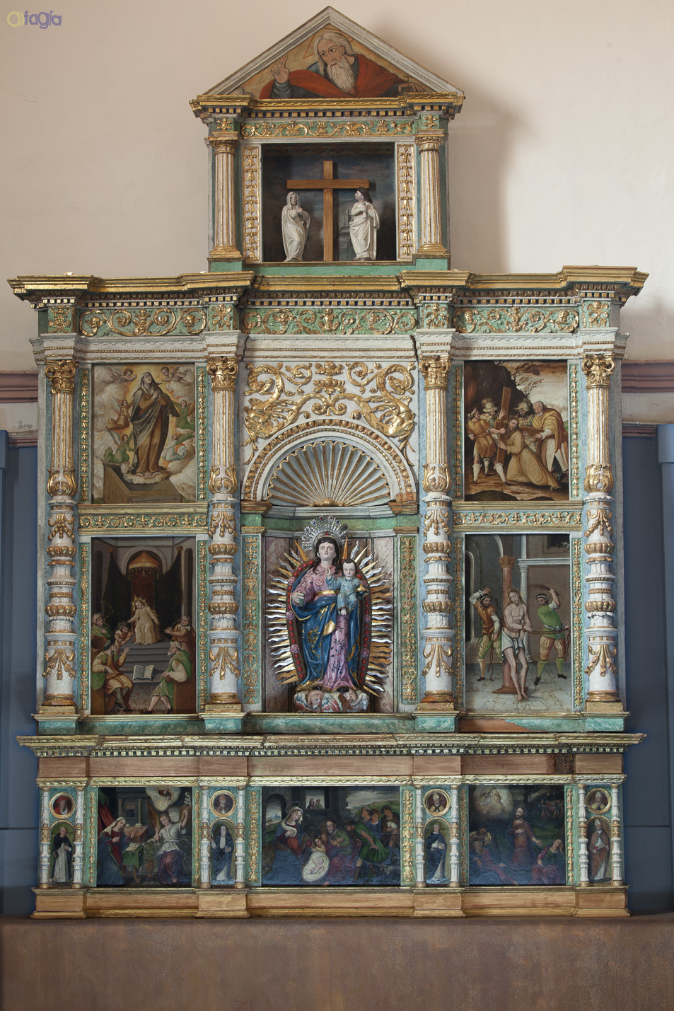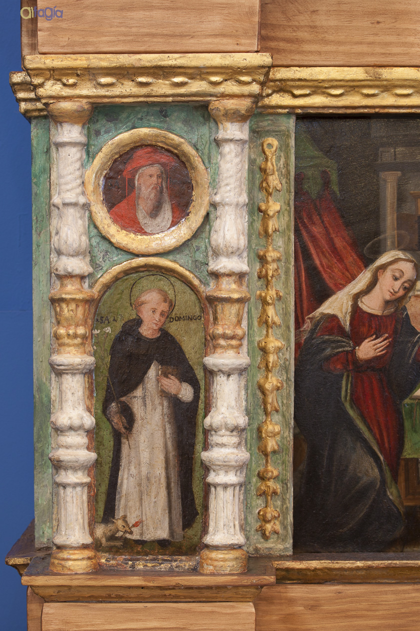 En 1565 se erigió este retablo dedicado a la Virgen del Rosario, una avocación que instaurara Domingo de Guzmán. Ese mismo año la muerte del papa Pio IV, Il Medichino, señaló el final de la época de florecimiento artístico y cultural que supuso el renacimiento.