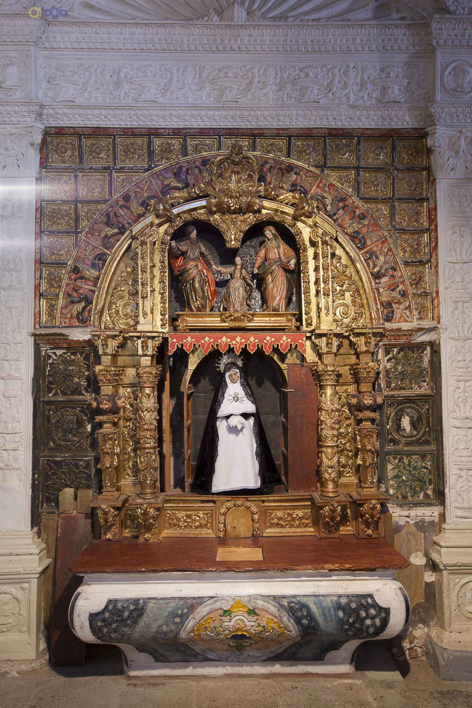Estas últimas imágenes muestran el retablo de Ntra. Señora de la Soledad insertado en el nicho descrito por los guarnecidos de yesería. Por efecto de la policromía el ático semicircular adaptado a la exedra, que en origen tiene labor de yesería, adopta forma rectangular enmarcándose en el pórtico romanista. La segunda imagen muestra un detalle del grupo escultórico superior: