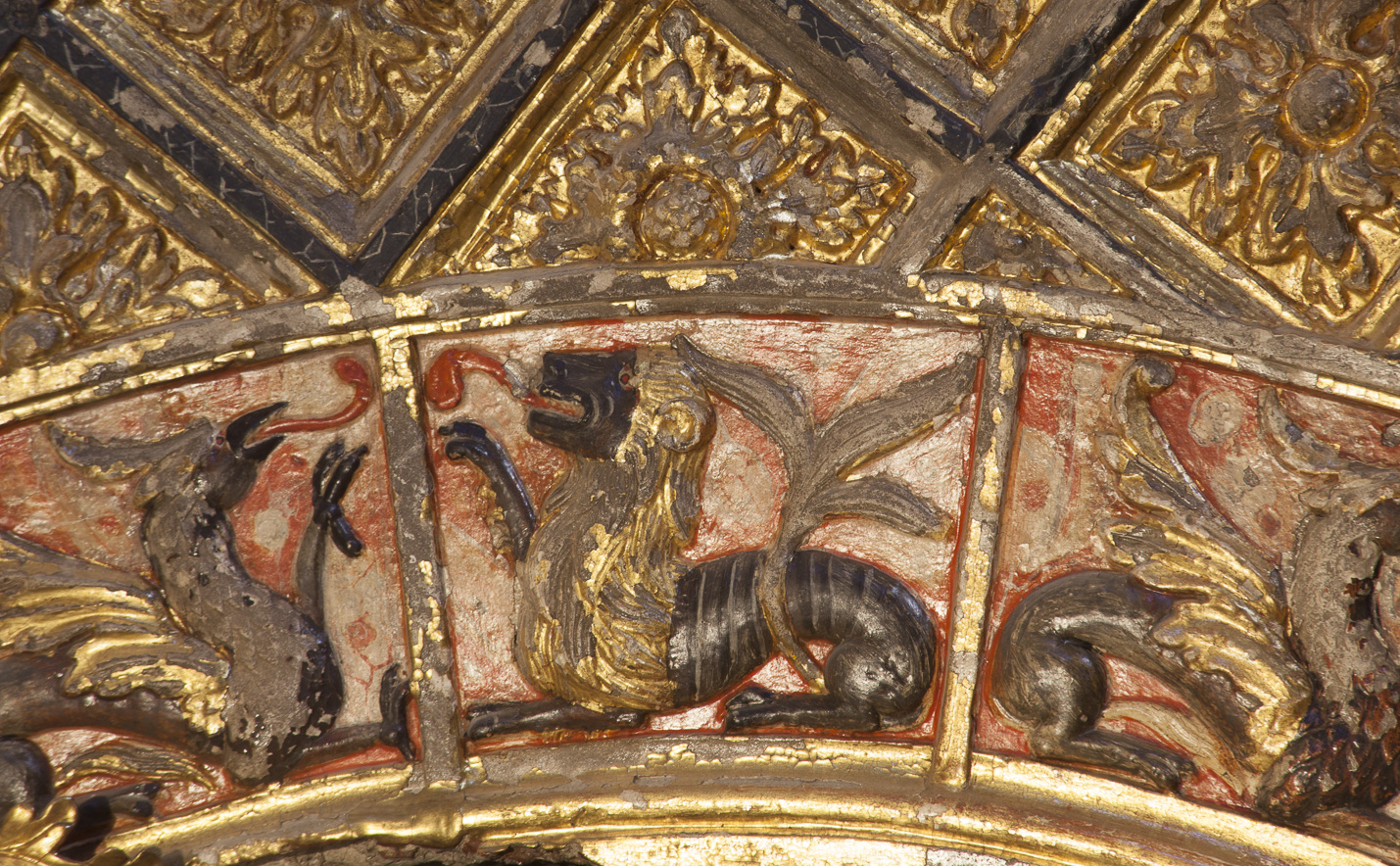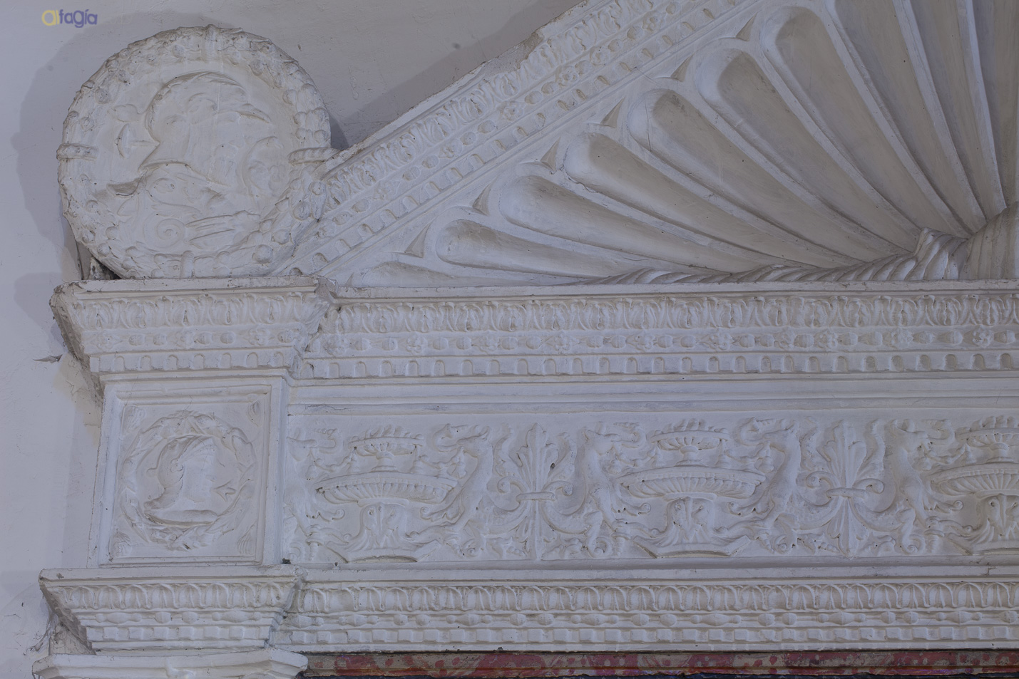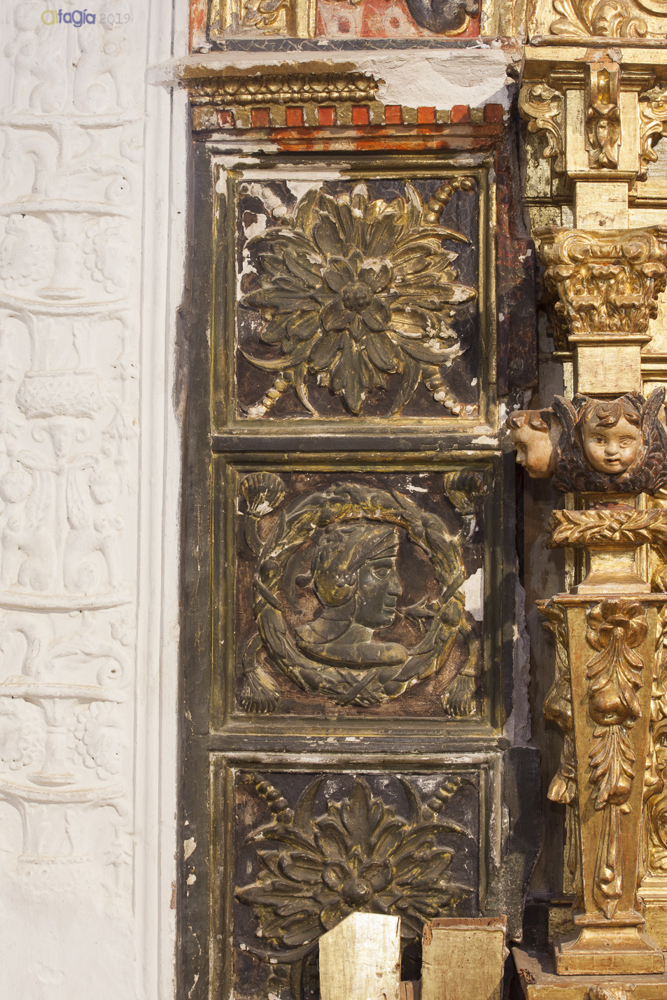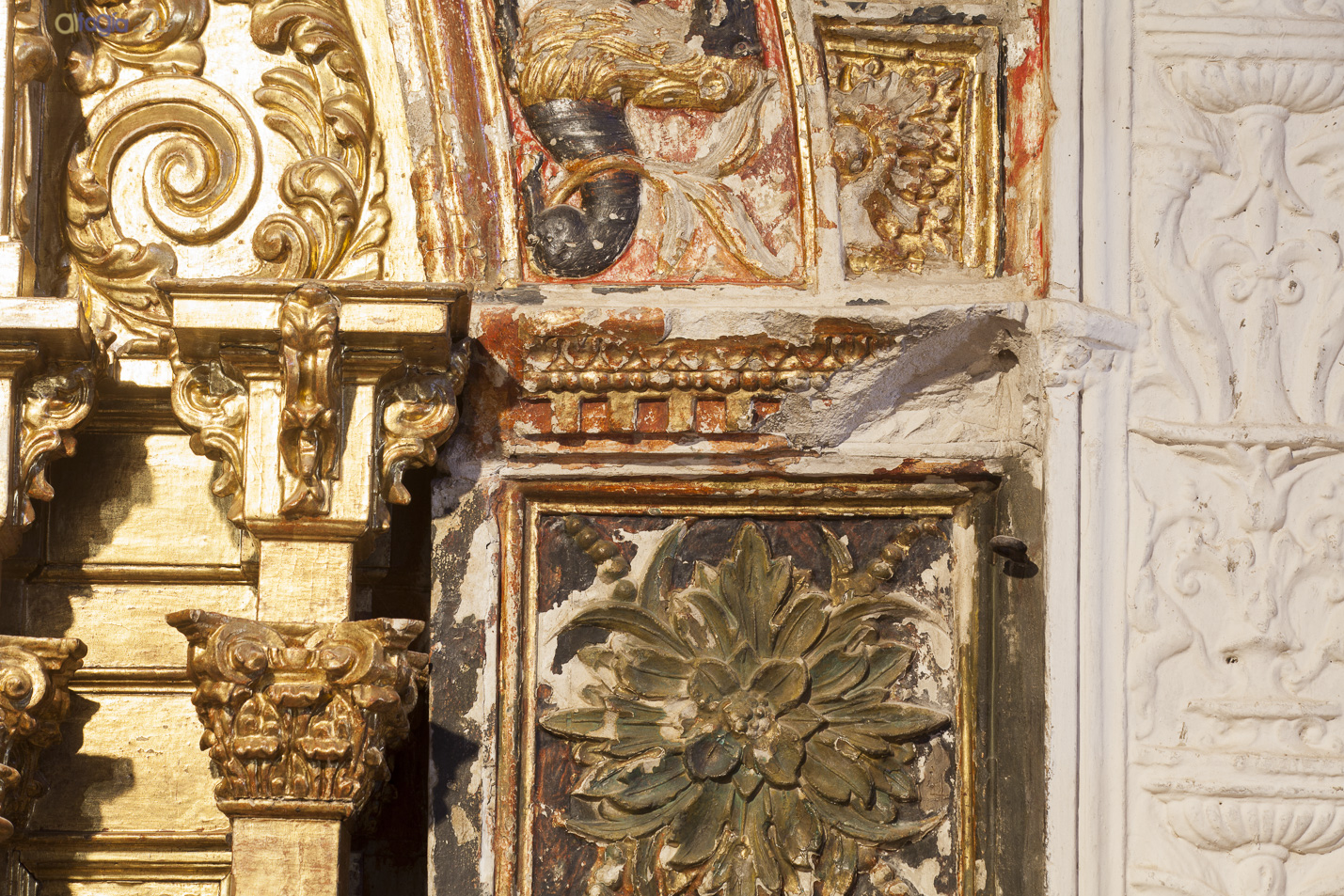 En otros casos, los yesos se muestran subvertidos por policromías, dorados y repolicromados variando la tonalidad blanca de su terminación.