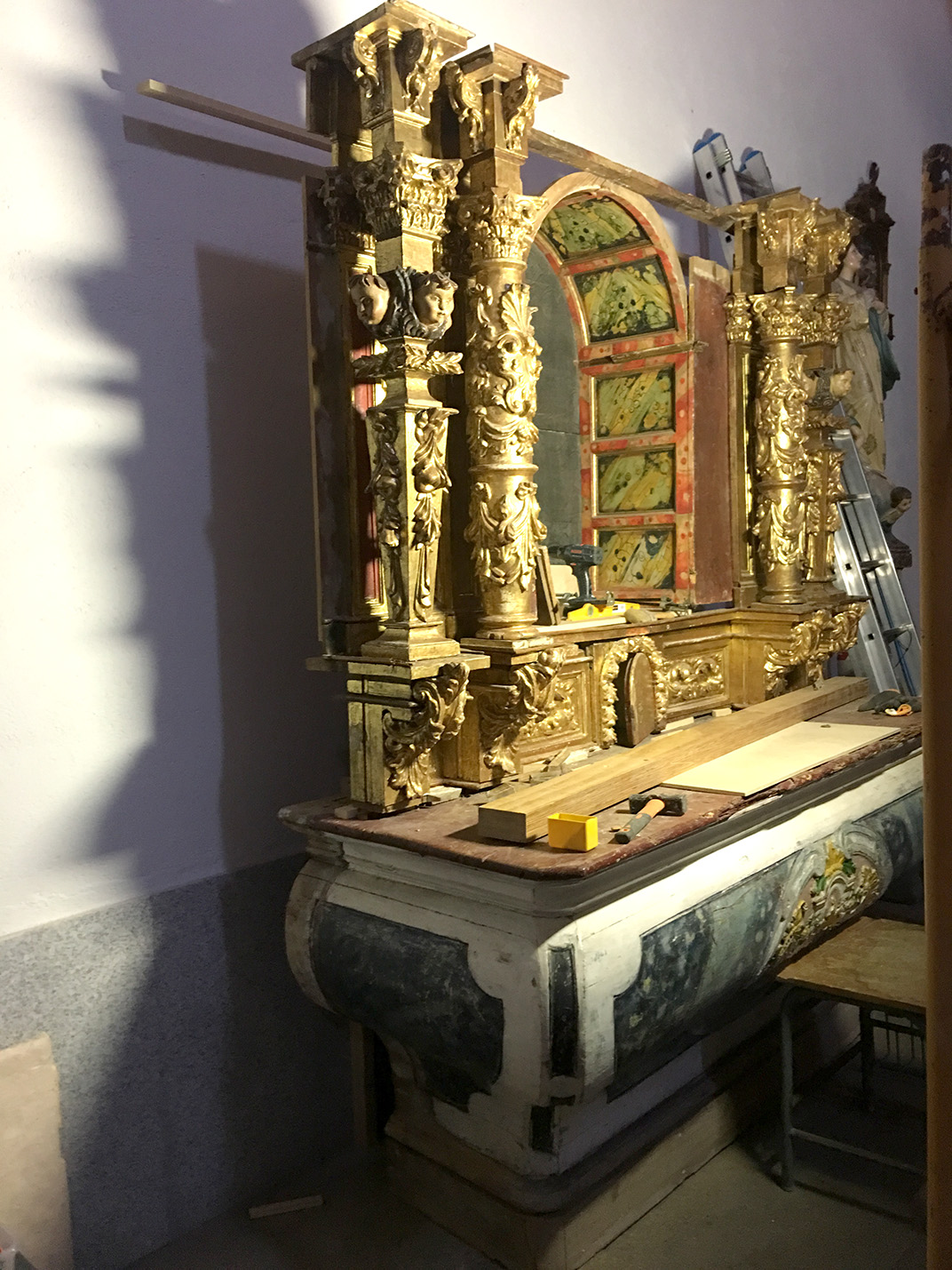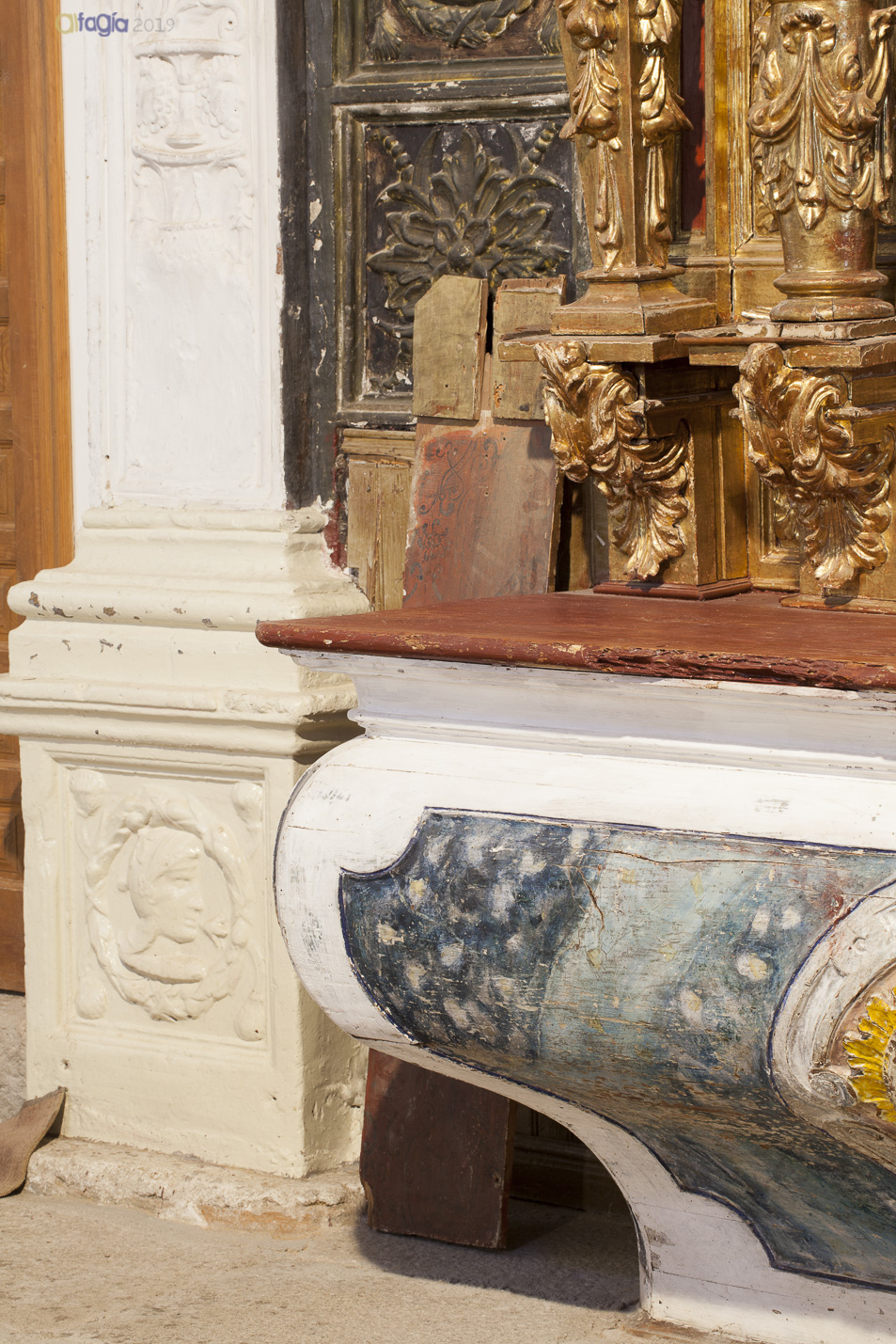 - Hemos localizado almacenados en la iglesia otros 4 fragmentos de esta última moldura. Probablemente los fragmentos se desprendieran al realizar el desmontaje de parte del entallado del retablo retirado para inspeccionar el interior del arcosolio.