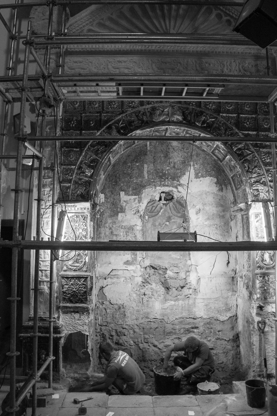 Comenzamos retirando la suciedad superficial siempre desde la parte superior en sentido decreciente. Eliminamos las reposiciones de morteros de baja calidad y aquellas que ocultan parcialmente las yeserías originales. En paralelo procedemos a la consolidación de las partes fisuradas de los yesos.