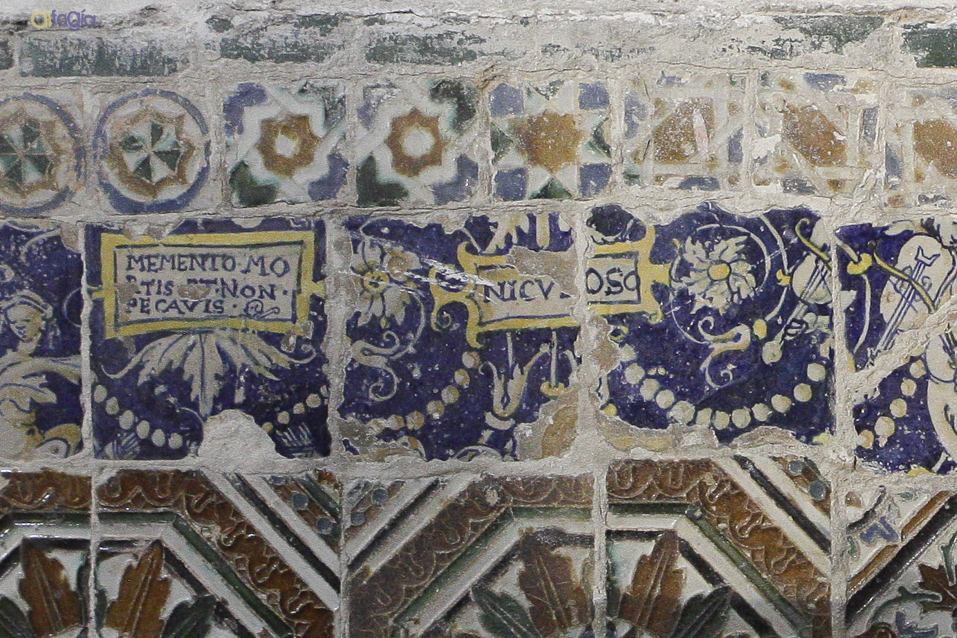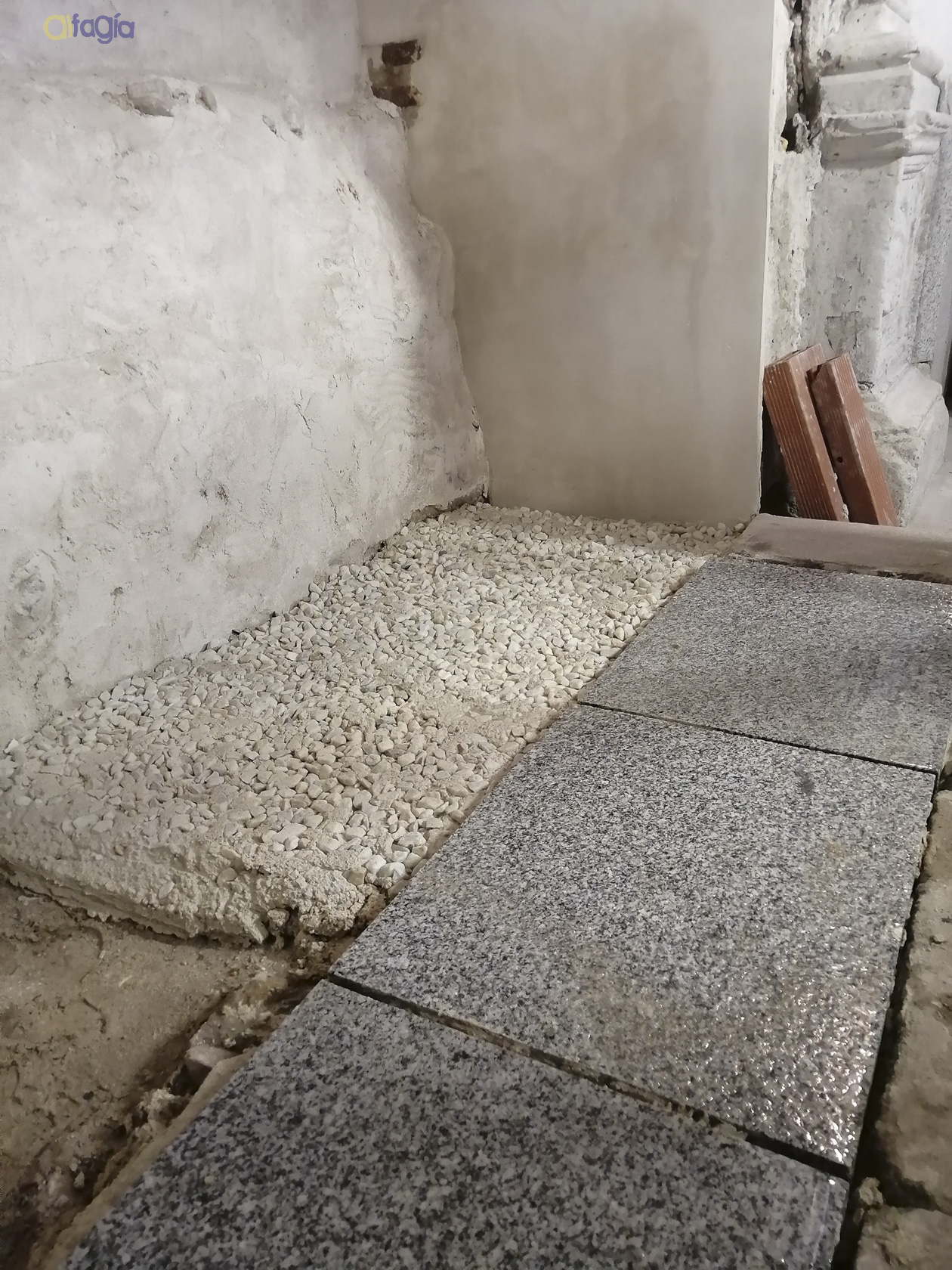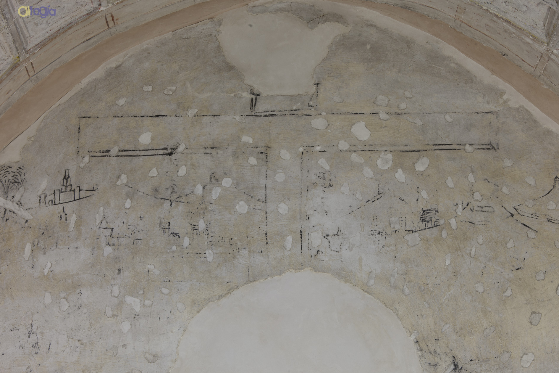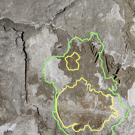 - Mortero con los grafismos correspondientes a un estrato de sinopia relacionada con los restos del siglo XVI que son visibles a la derecha del nicho barroco, en el frontrispicio. Hemos localizado 59 fragmentos de este tipo de mortero, que corresponde al estrato inferior de los morteros del paramento.