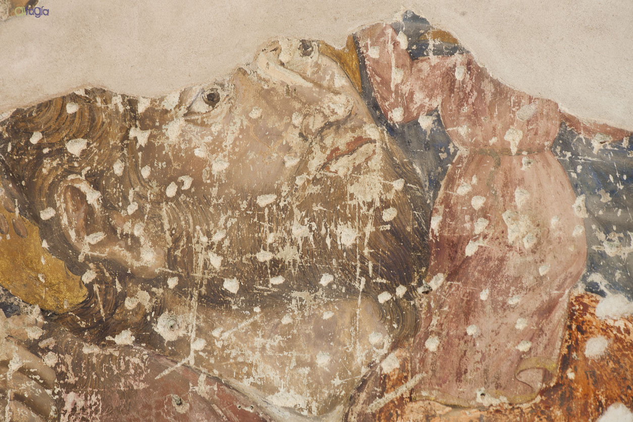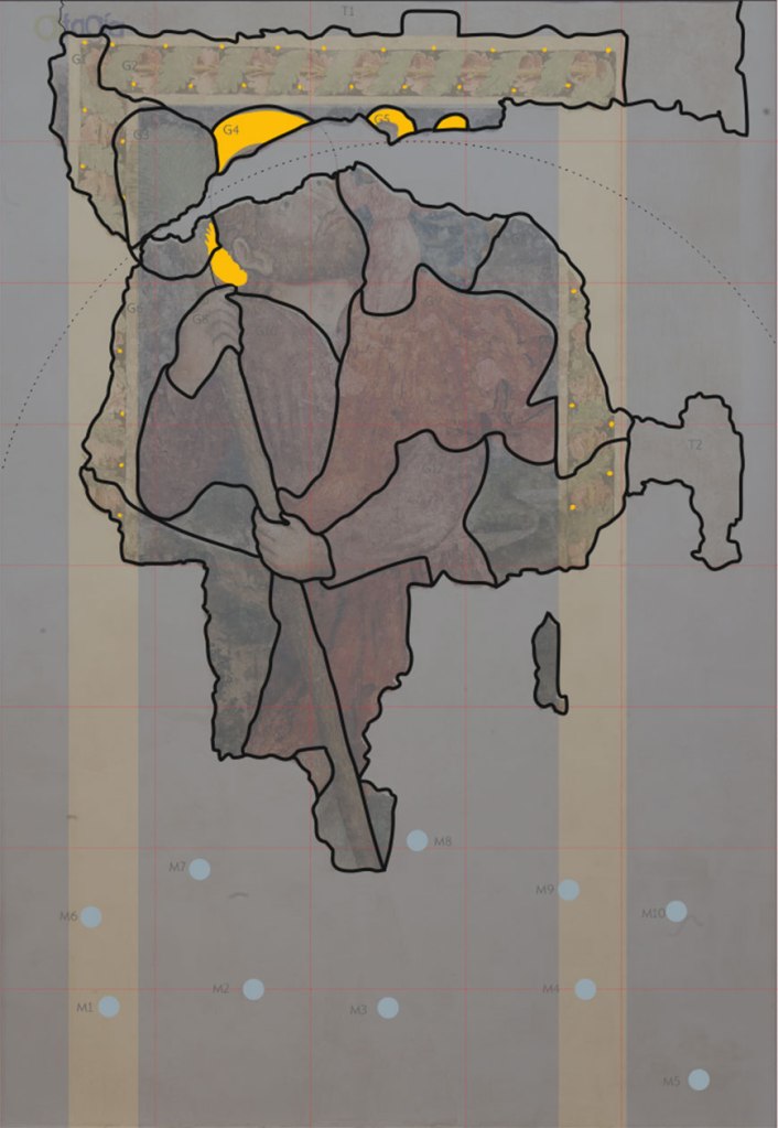 En cuanto a las pinturas situadas en el muro sur del crucero, al comenzar observábamos un enjambre de líneas, texturas y colores. Podíamos intuir ciertas composiciones pictóricas, con distintas técnicas y cronología, compartiendo el espacio sin un programa iconográfico común. Era el resultado de numerosas catas de prospección entre las que sobresalían dos importantes restos figurativos situados en los extremos.