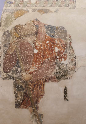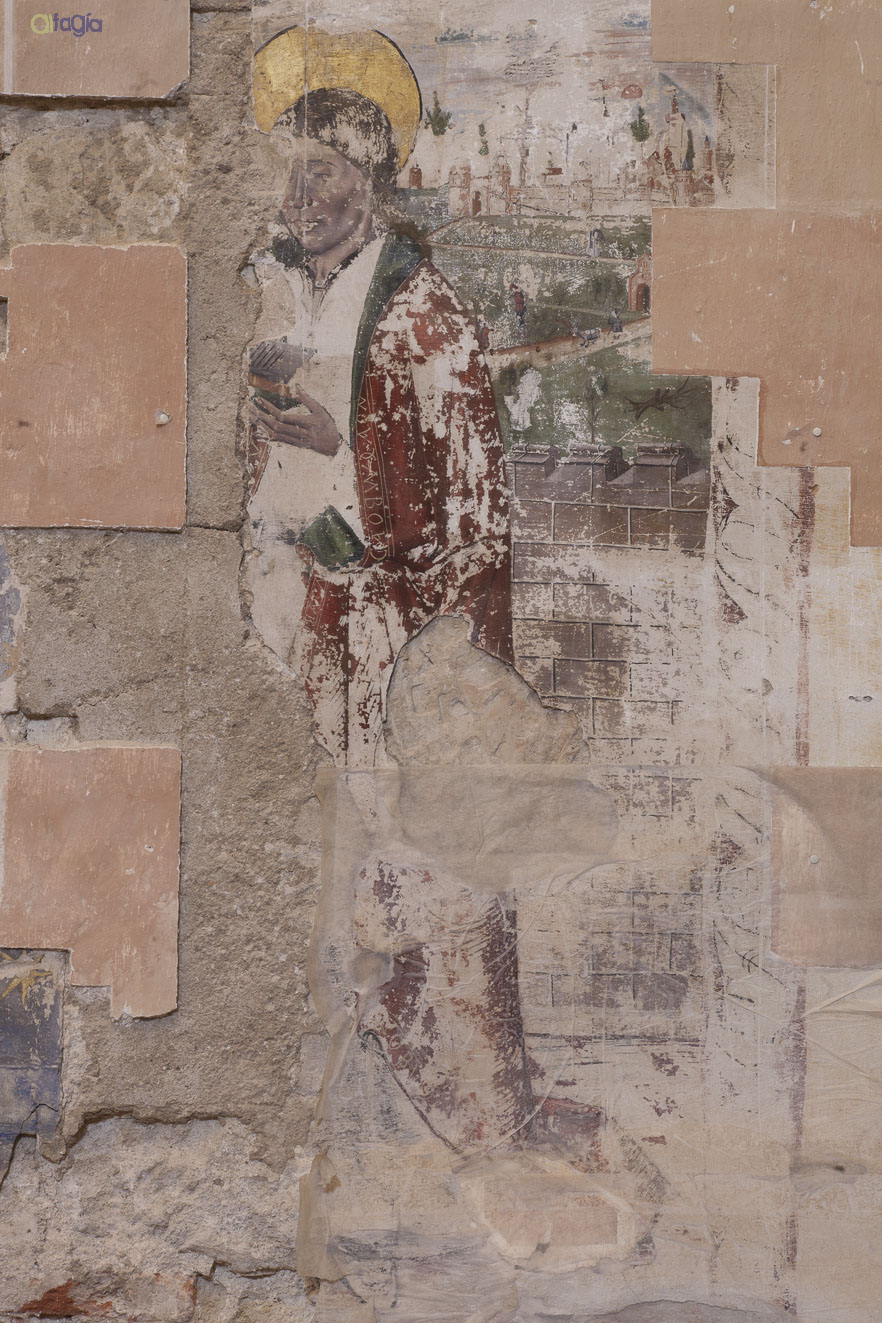 Los distintos restos de pintura recuperada, junto a distintos morteros de los siglos XVI al XVIII, completa las partes visibles de las figuras junto al texto fraccionado de la filacteria, situada sobre la escena del Santo Obispo.