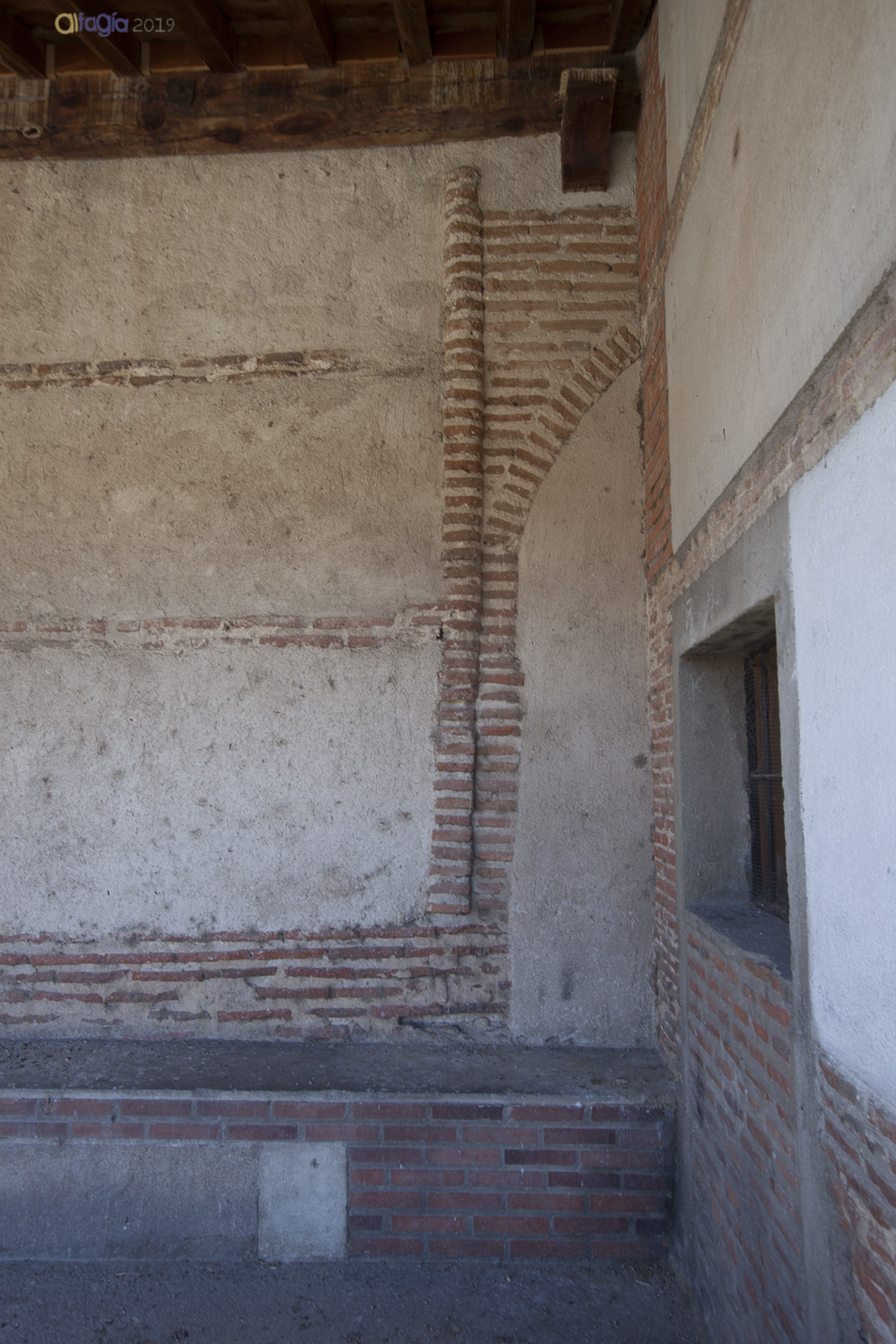 - Puntualmente, bajo los yesos aparece parte de la fábrica de la nave en los laterales de la monumental hornacina. Vemos una ordenada sucesión de ladrillo mudéjar con el llagueado en bisel que aún conserva sin apenas deterioros en la zona izquierda del monumento. La pérdida del revestimiento nos permite ver parte de las jambas de la arquería del pórtico reutilizado.