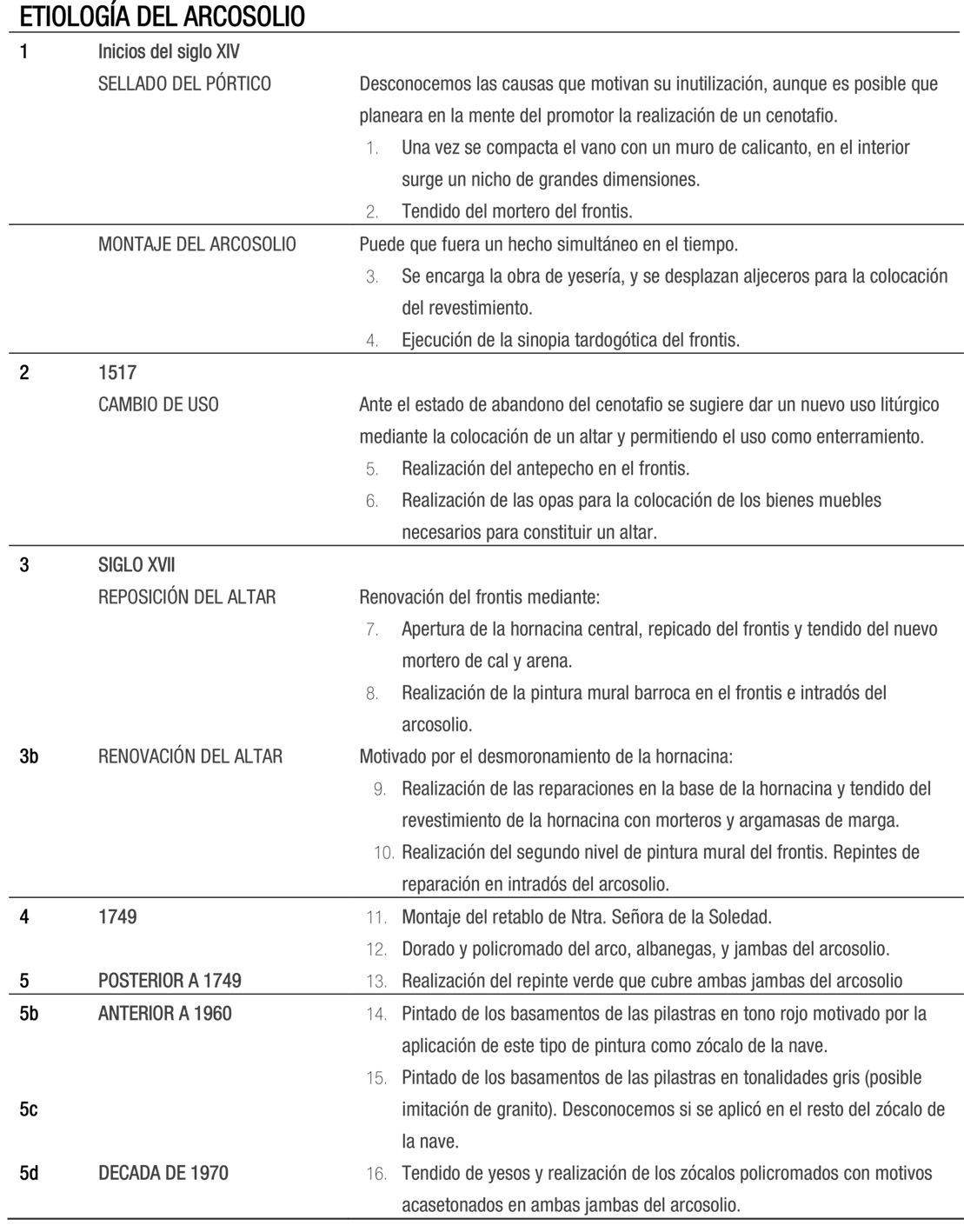 Analizando la superficie mural podemos organizar la sucesión de todos los vestigios observados con el siguiente orden: