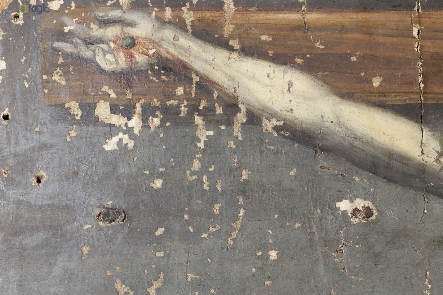 Es en los planos de detalle y macrofotografías es donde podemos observar los desperfectos que afectaban a la imagen pictórica: oxidación de barnices y acumulación de pátinas; descamación y pulverulencia de compuestos; deformación del plano pictórico por la formación de lascas y los movimientos higroscópicos de la madera, red de craquelado de edad o reticular con pérdida de materia original.