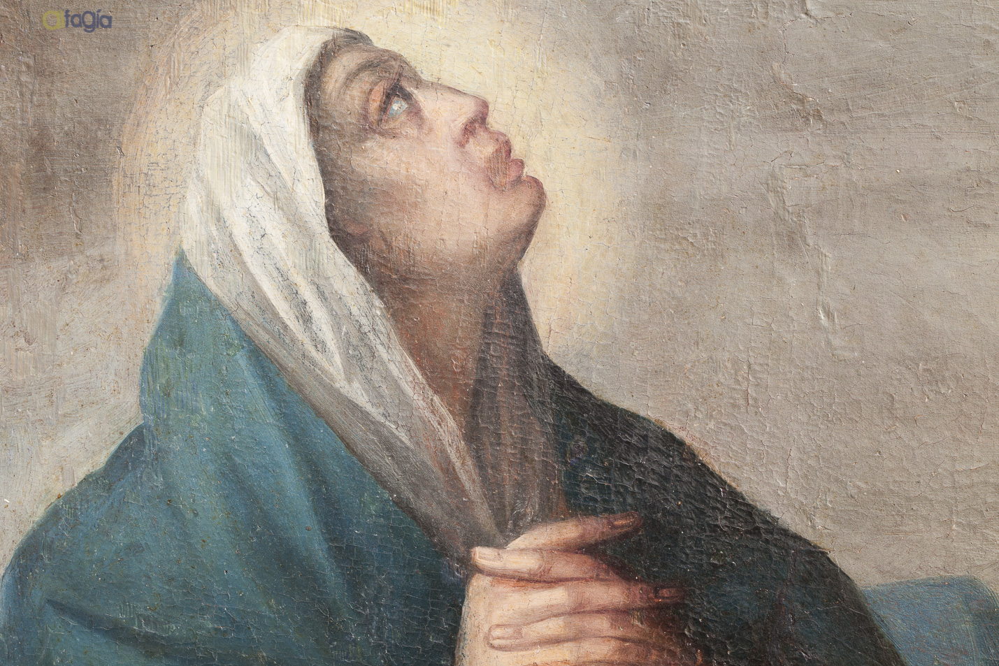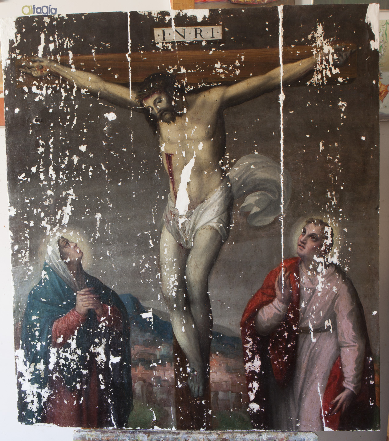 Ese era el aspecto de la pintura antes de su restauración. Observábamos numerosas faltas de película pictórica quedando visible el estrato blanco de la preparación, así como un tono pardo y opaco que distorsionaba la paleta original y dificultaba la visión de la composición.