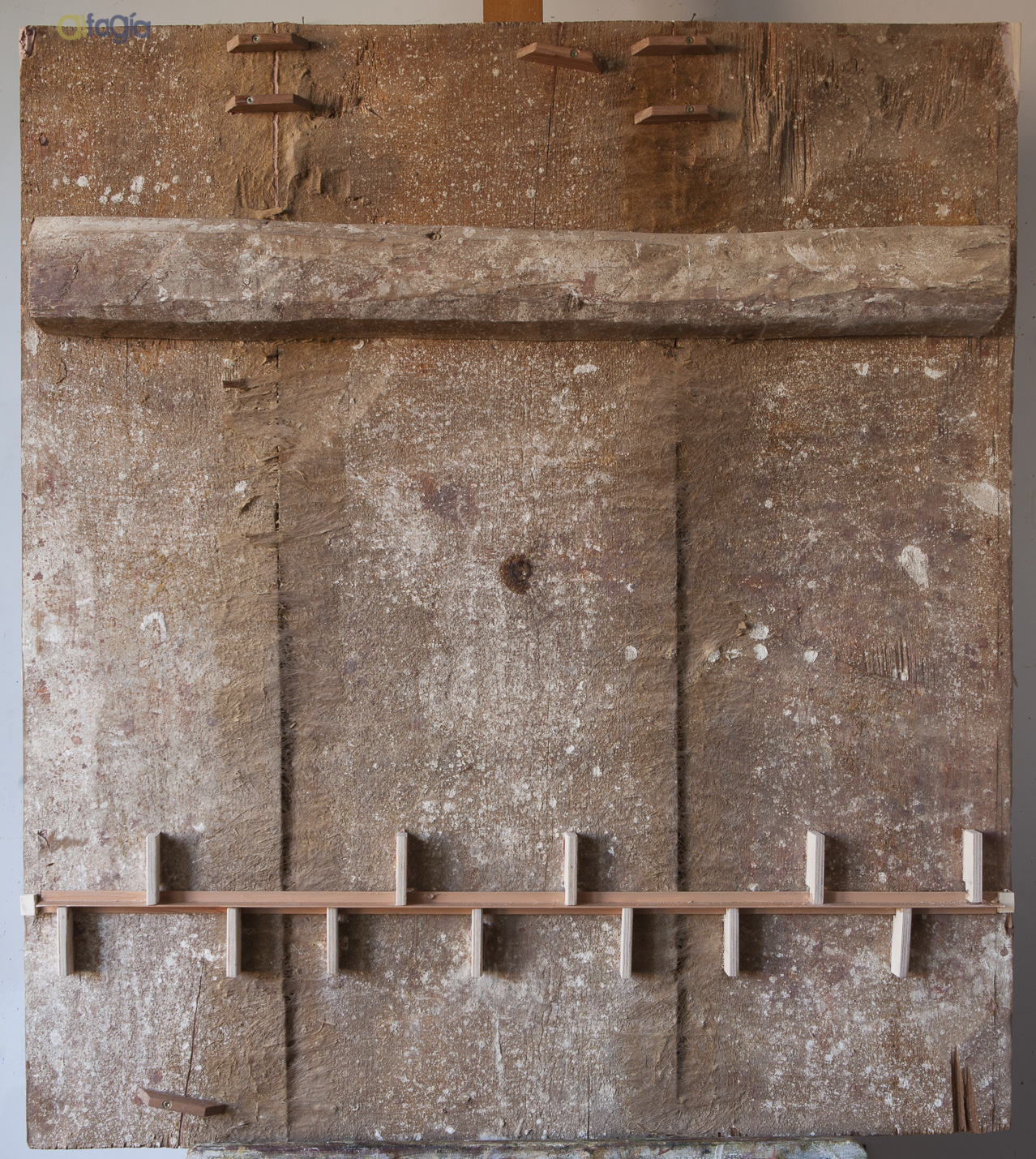 El siguiente grupo de imágenes muestra el reverso de la pintura antes y después del tratamiento. Como la pintura fue seccionada en su parte inferior antes de reutilizarla en el retablo, había desaparecido el barrote de sujeción que aseguraba el soporte de madera. En Alfagía se ha realizado un embarrotado móvil de aluminio con fijaciones de madera microlaminada asegurando el soporte ante el movimiento de la madera.