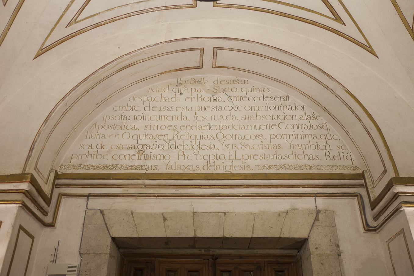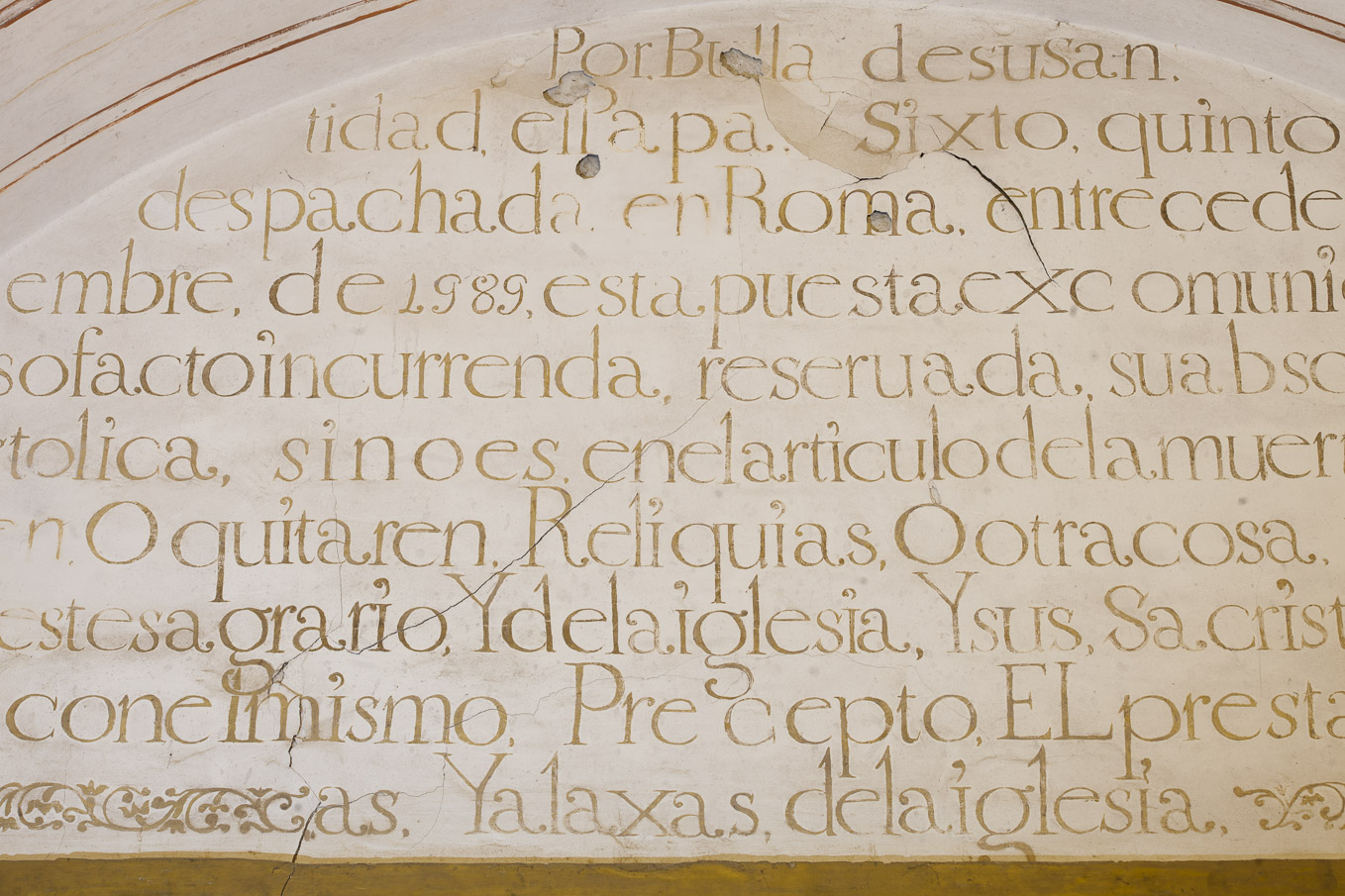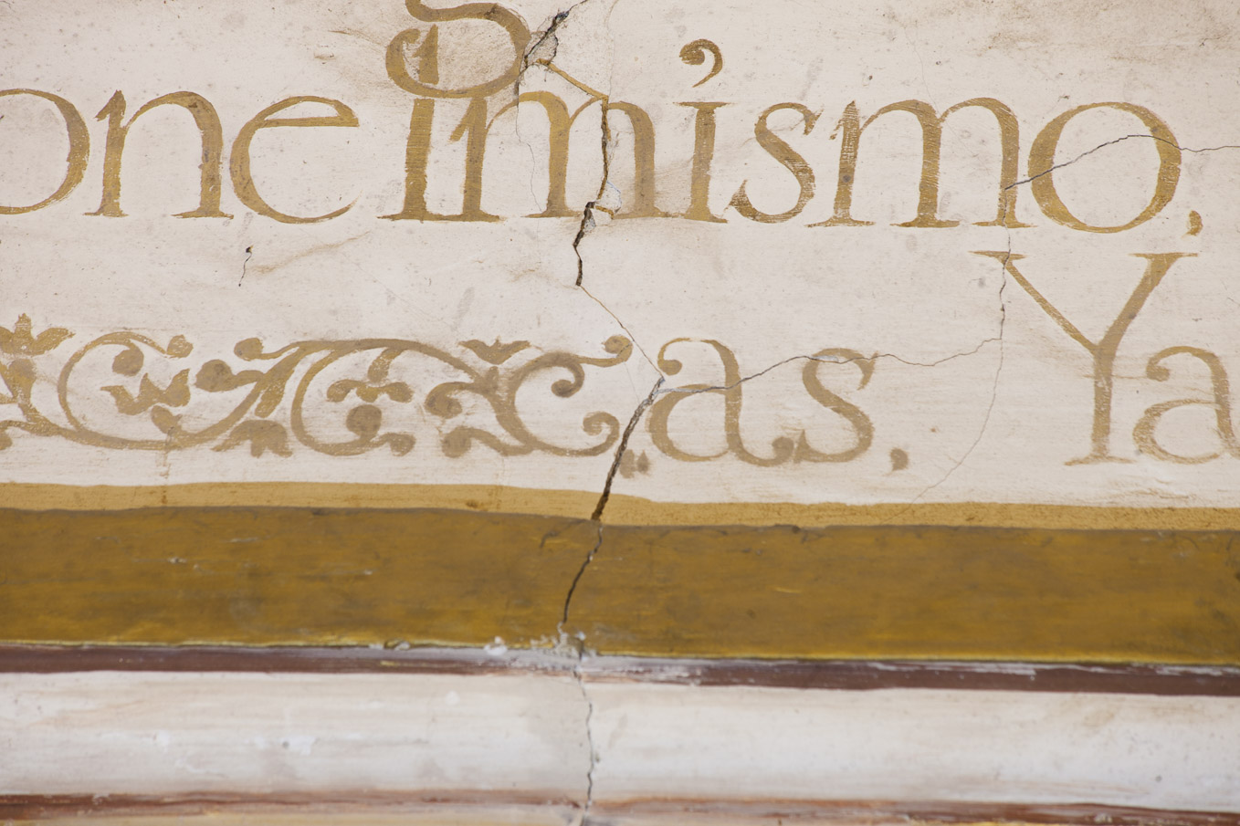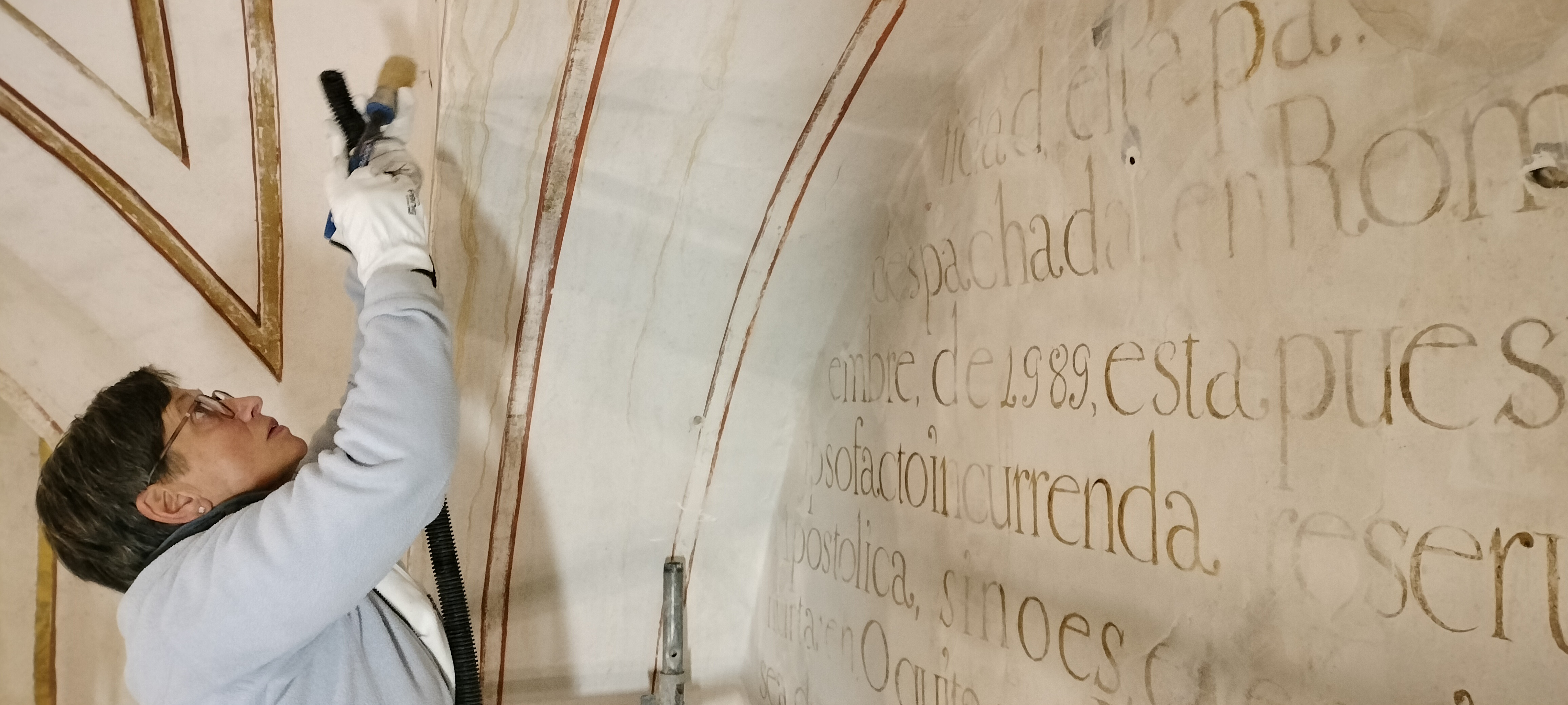 El texto se realizó alla prima, aplicado a pincel sobre el enlucido de yeso. Apenas quedan visibles las huellas de las líneas de encaje, necesarias para proporcionar el tamaño de las letras y acomodar la distribución de las líneas en la superficie del luneto.