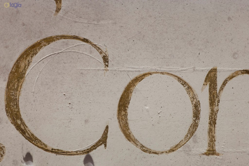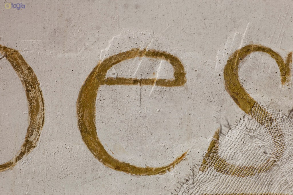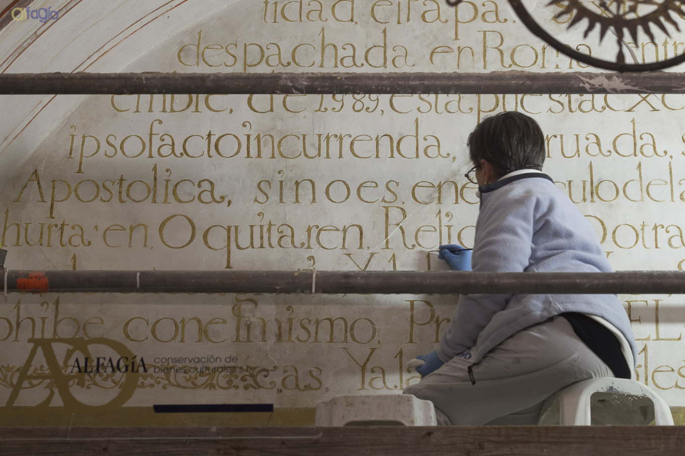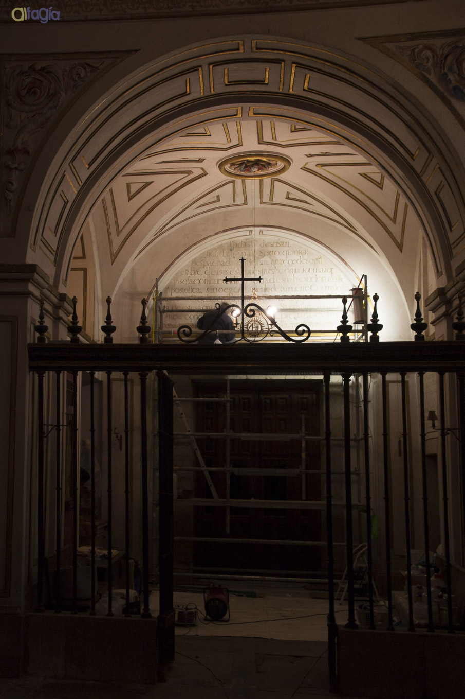 El texto se realizó alla prima, aplicado a pincel sobre el enlucido de yeso. Apenas quedan visibles las huellas de las líneas de encaje, necesarias para proporcionar el tamaño de las letras y acomodar la distribución de las líneas en la superficie del luneto.