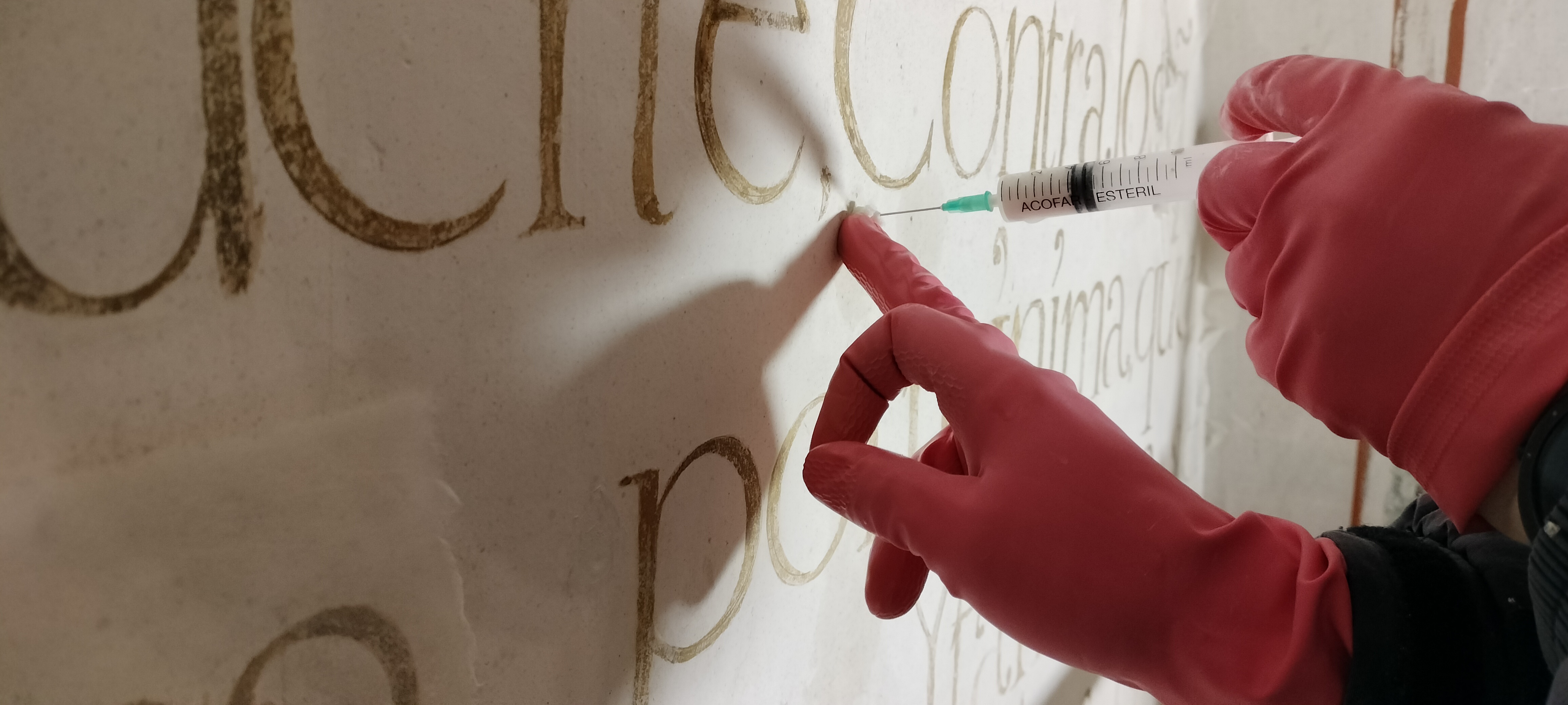 Desde ese momento se intervino mediante la inyección de morteros líquidos. Debido al número de deplacaciones, y la separación con la sillería del soporte, la introducción de los morteros supone uno de los procesos más extensos de la intervención. Los elevados niveles de humedad ambiental, y la dificultad para su evaporación, incrementaron los tiempos de curado. Entre los días de introducción del adhesivo era inevitable dejar periodos de secado para permitir a cementación y reducir la humedad en el paramento.