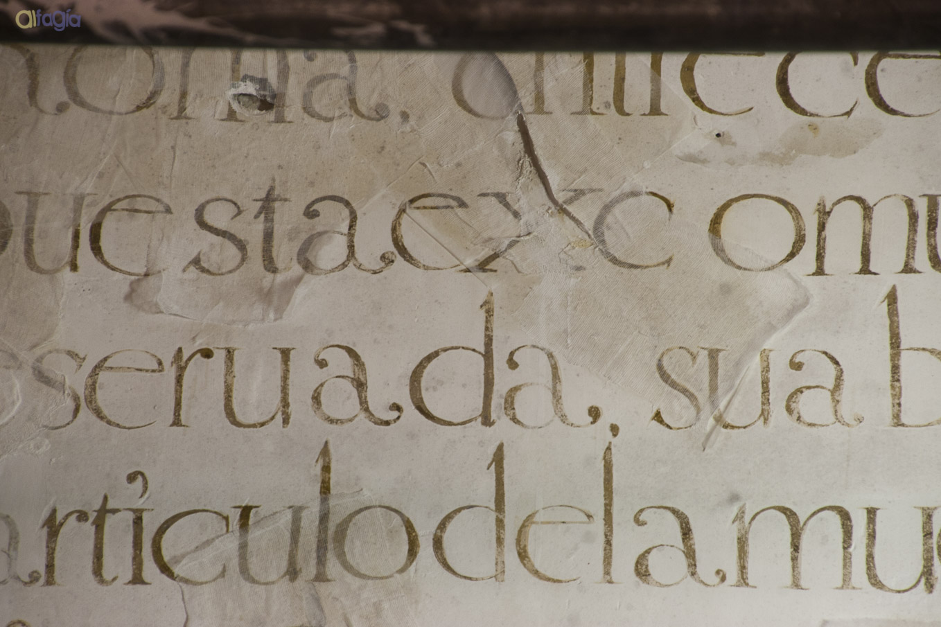 Mediante luz rasante podemos ver los rehundidos correspondientes al esquema sobreinciso. EL trazado recorre casi como un esqueleto ondulado la superficie, y sirve como guía autógrafa.