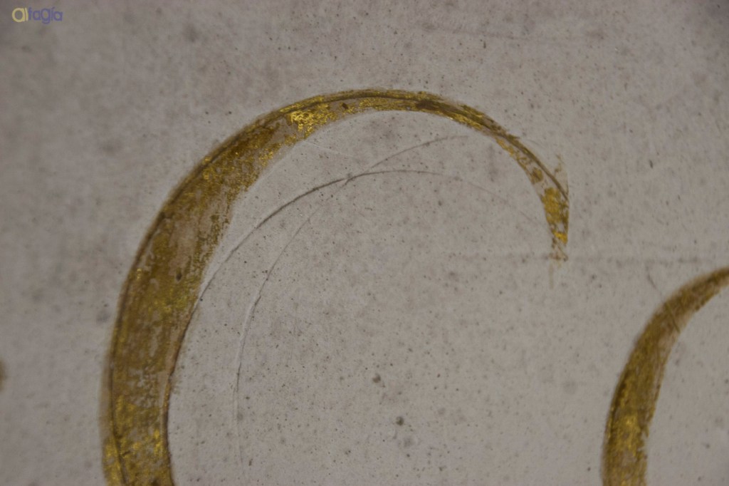 La inscripción está pintada sobre ese último enlucido, sirviendo el blanco de yeso como fondo de la leyenda. El oro no evidencia ningún tipo de preparación, como si pueden tener otros motivos lineales de la capilla.