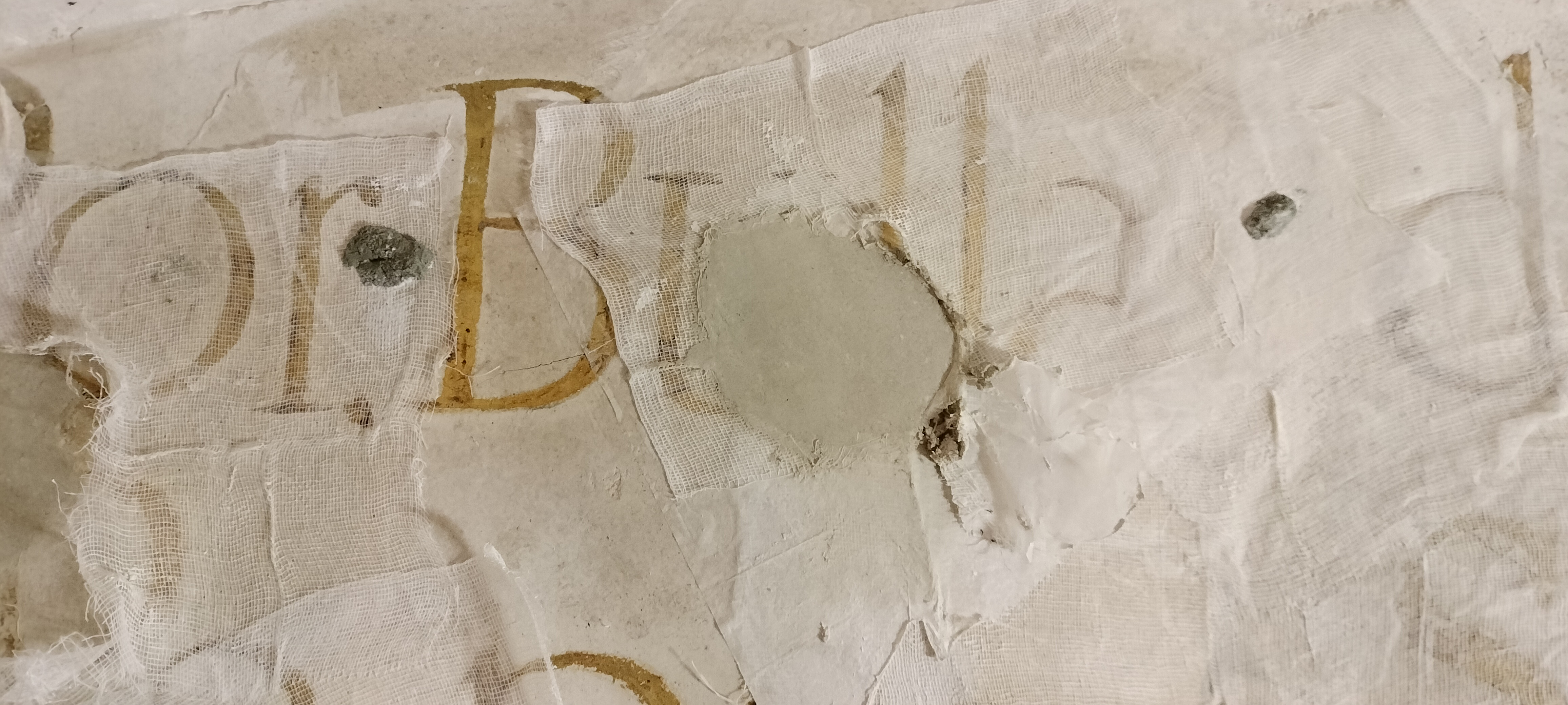 Por tanto, mediante la reintegración tratamos de potenciar las partes desgastadas del oro, favoreciendo la percepción de los signos gráficos, y facilitando su lectura. En el caso de los morteros nuevos, matizamos los blancos en algunas lagunas llamativas mediante tramados tipo rigattino.
