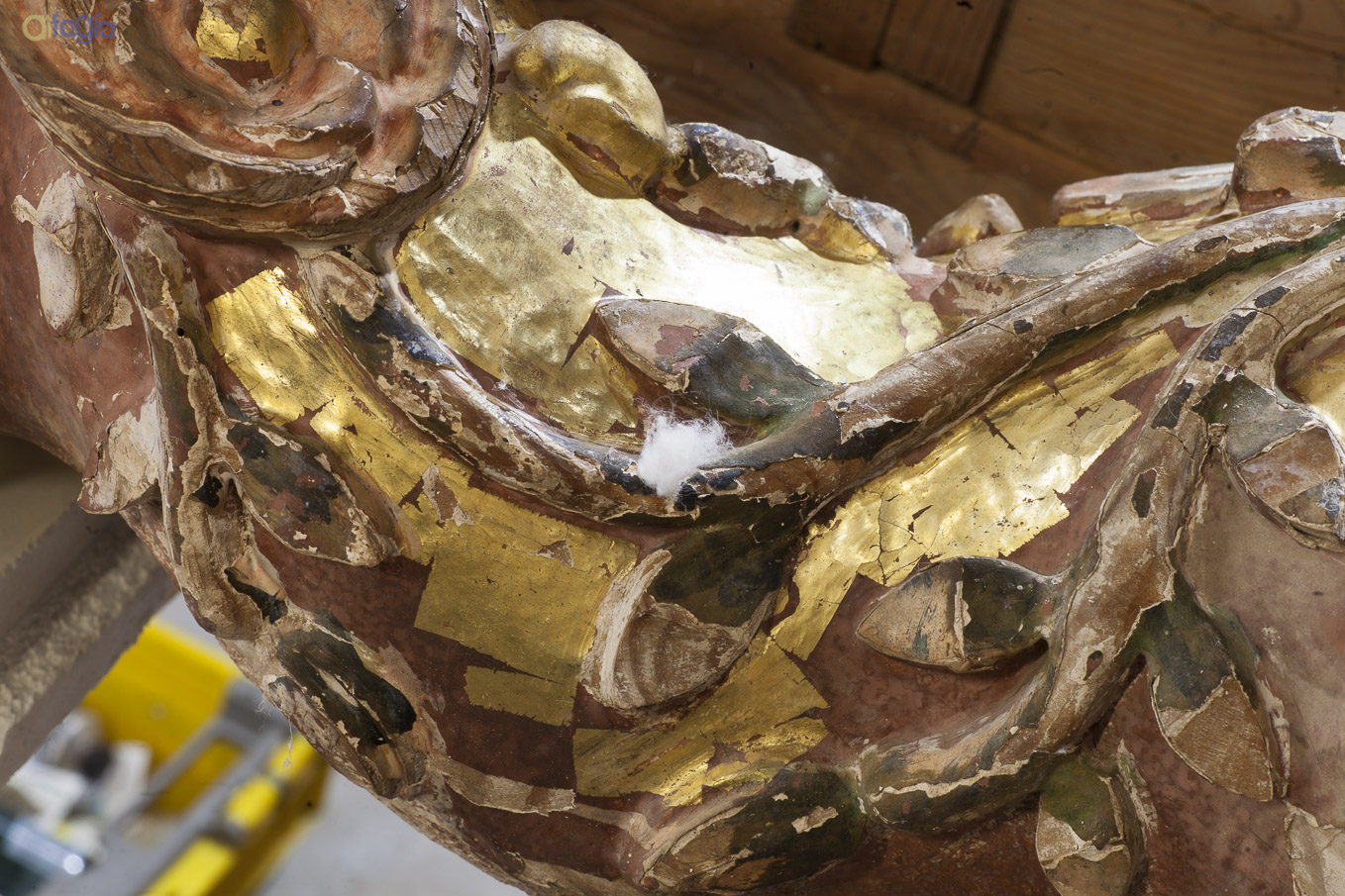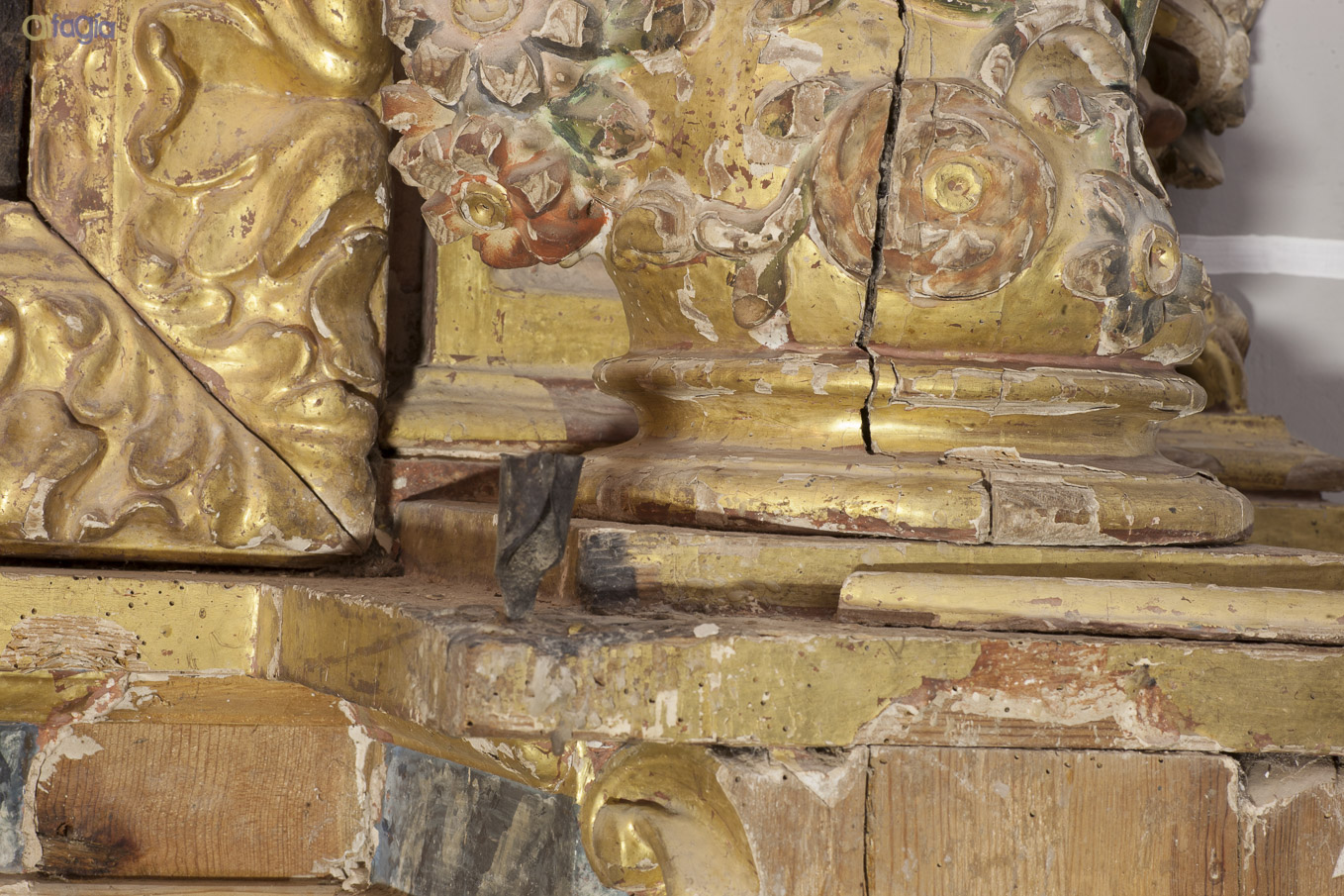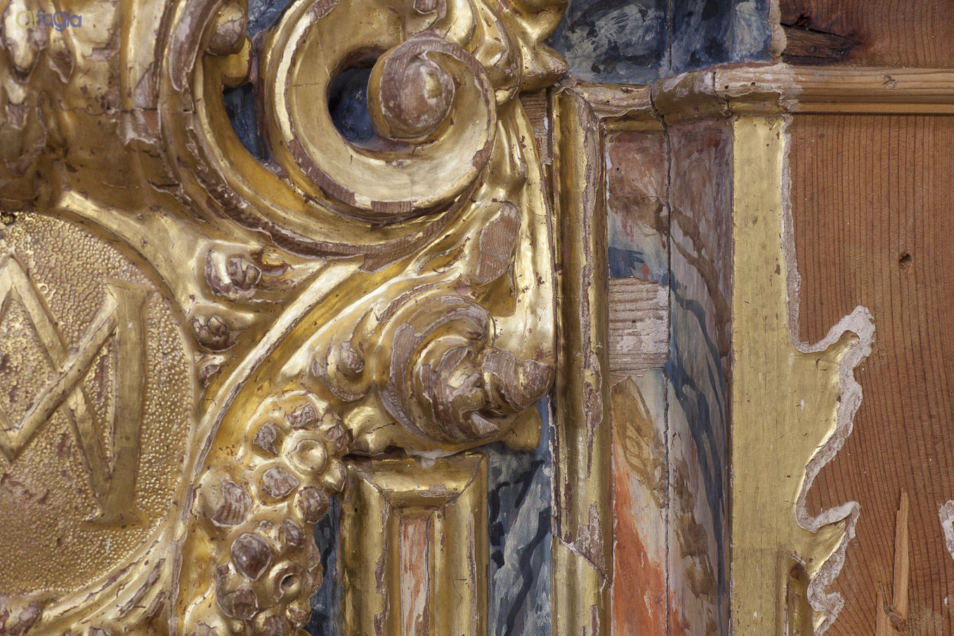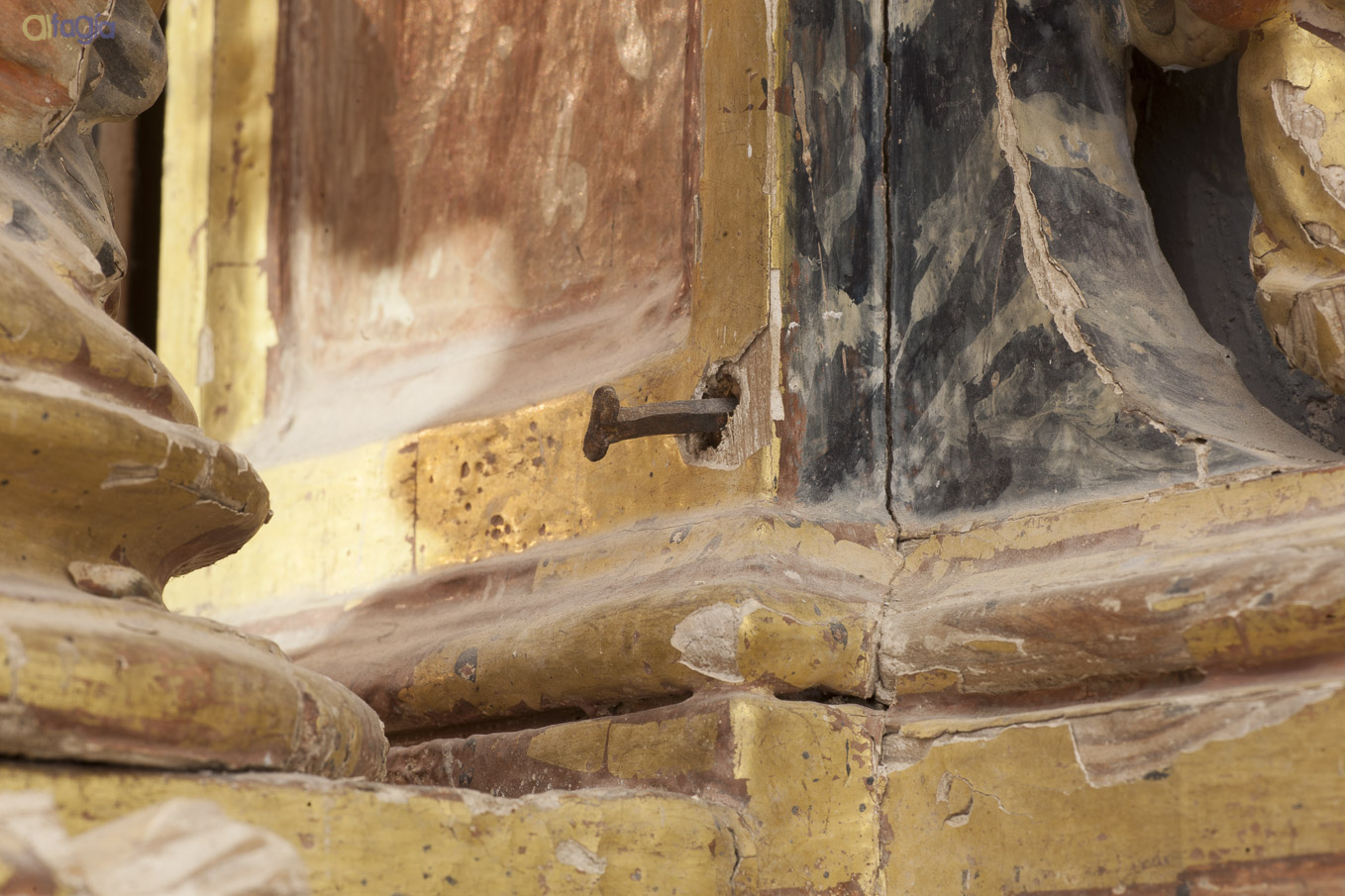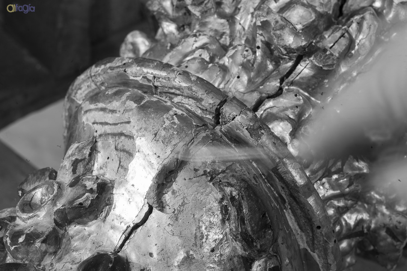En cuanto al entallado hemos continuamos inspeccionando todas las superficies del retablo, los dorados y las policromías. Son las partes más alteradas del retablo. Después de varios días, pensamos que un defecto técnico es el detonante de los desprendimientos que acusan las terminaciones. En su momento, algo falló durante la confección de la preparación, desprendiéndose una gran parte del dorado y la policromía. Un proceso que aún en la actualidad permanece activo.