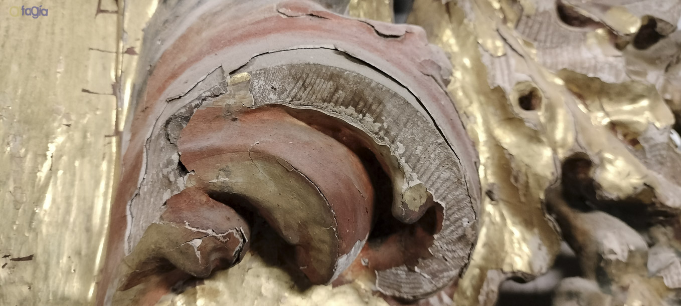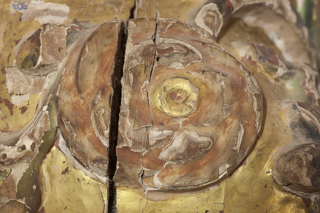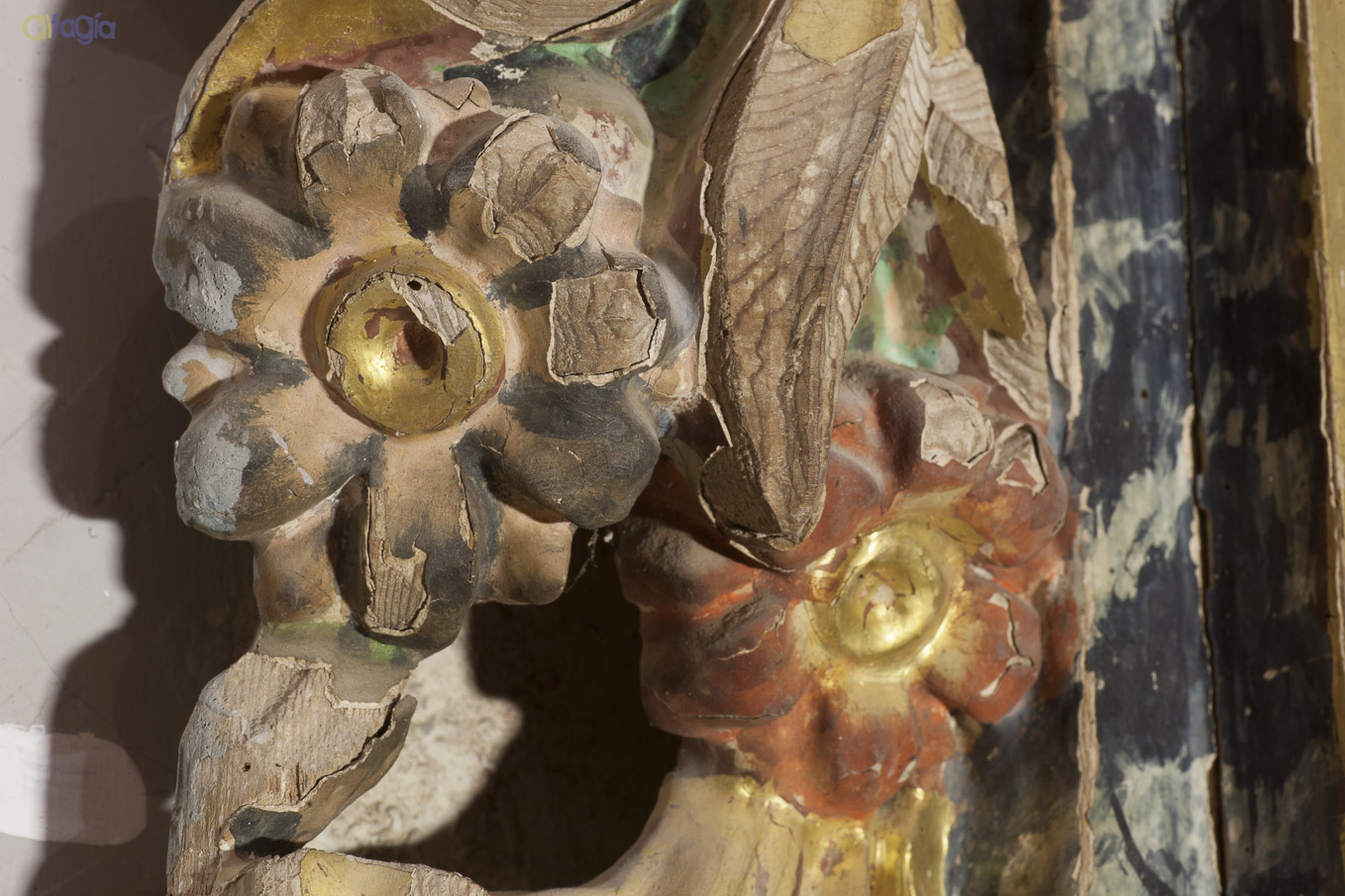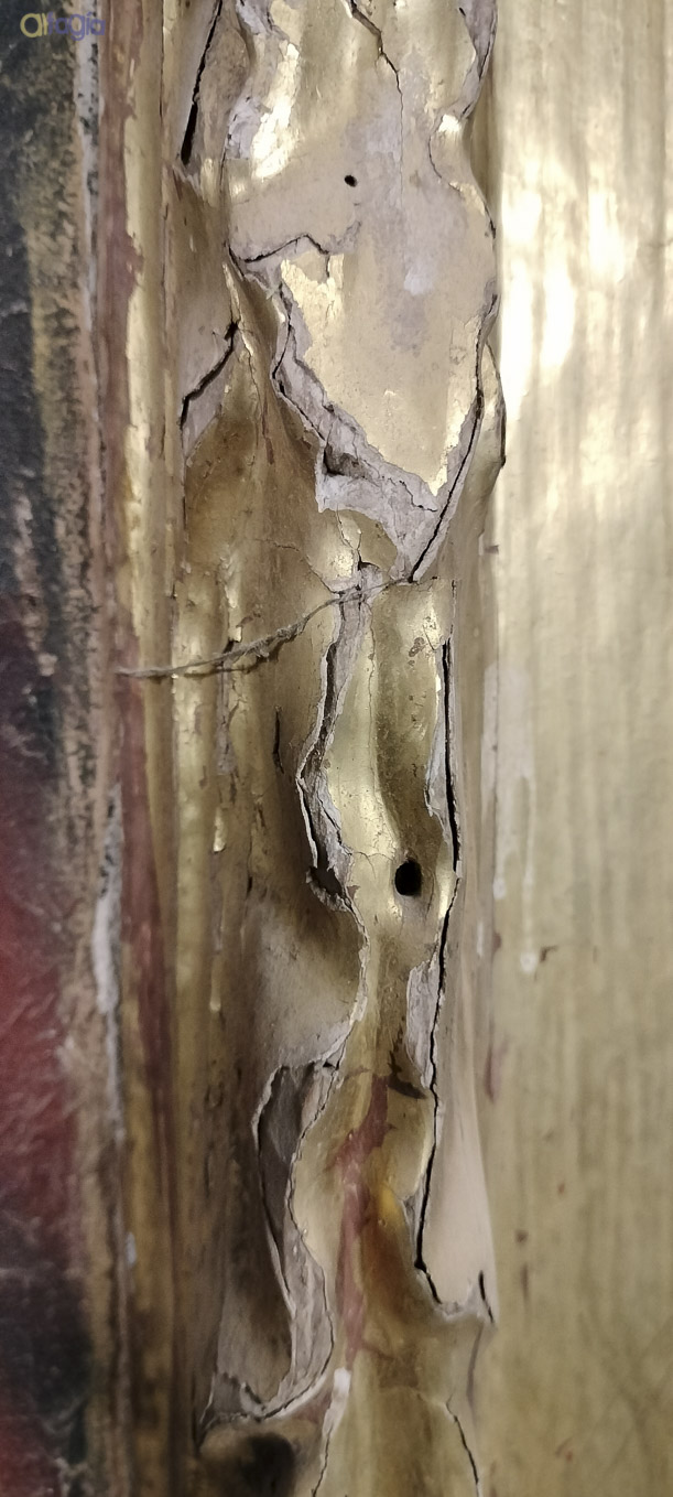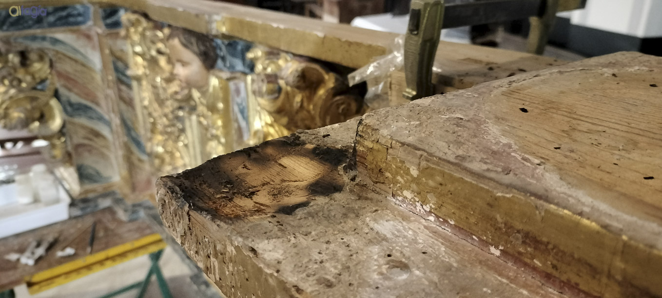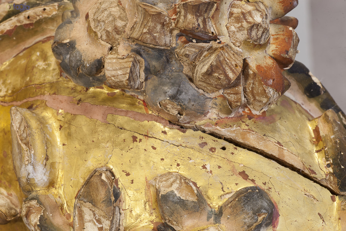 En cuanto al entallado hemos continuamos inspeccionando todas las superficies del retablo, los dorados y las policromías. Son las partes más alteradas del retablo. Después de varios días, pensamos que un defecto técnico es el detonante de los desprendimientos que acusan las terminaciones. En su momento, algo falló durante la confección de la preparación, desprendiéndose una gran parte del dorado y la policromía. Un proceso que aún en la actualidad permanece activo.