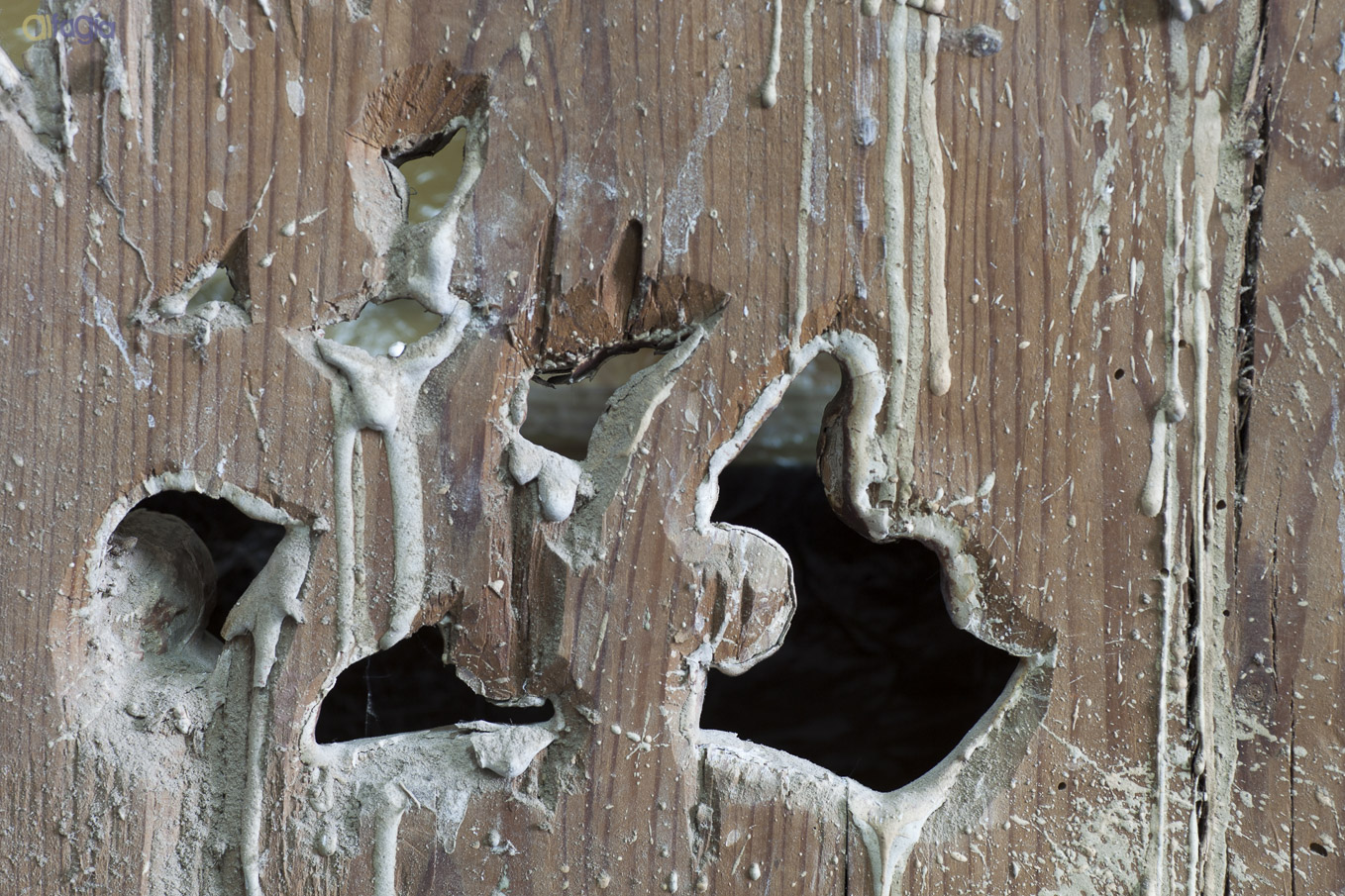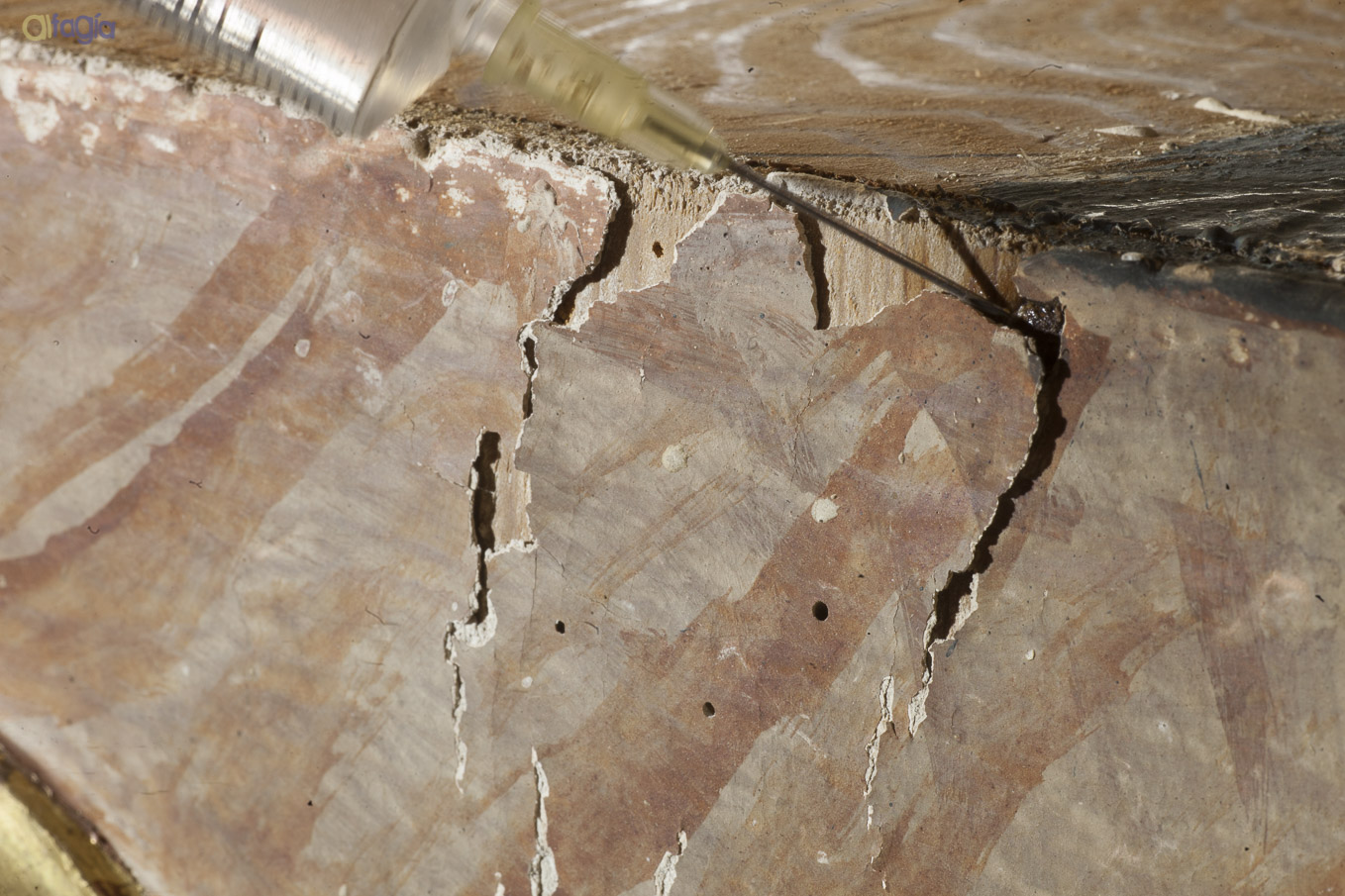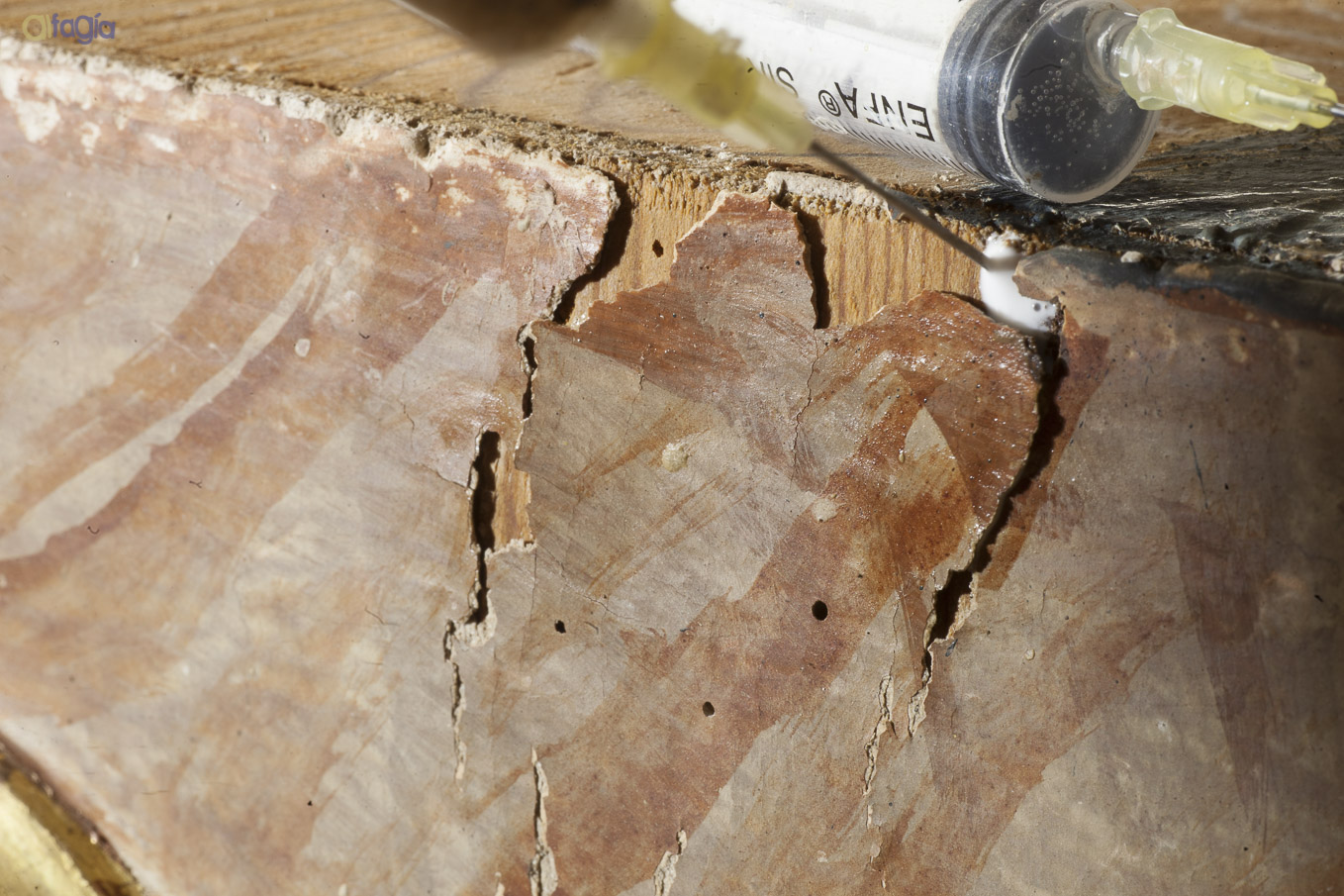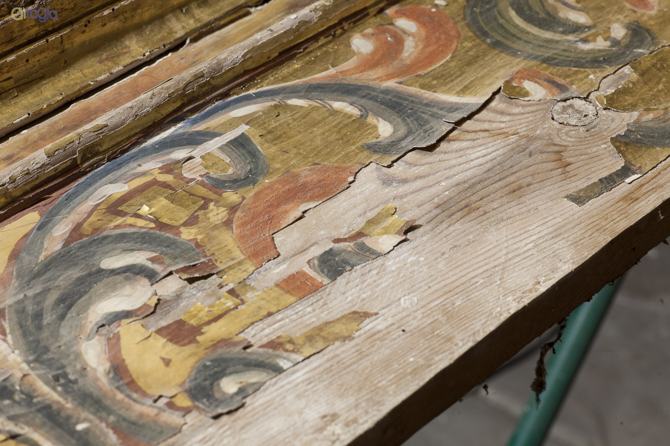Desde la semana pasada estamos realizado distintas pruebas, tratando de lograr la mayor efectividad con medios y técnicas de conservación adaptados al alcance de las lesiones. Sin embargo, el elevado nivel de los desperfectos, su distribución, y la precisión que requiere su tratamiento nos induce a modificar el tratamiento inicial. Vamos a realizar el desmontaje del ático pues, a priori, al intervenir individualmente en las piezas entalladas, el acceso e inspección de la superficie es superior, y con ello se incrementa la exactitud del tratamiento.