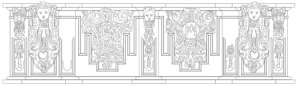 Pero en ocasiones, la modernidad tiende a esfumarse cuando, como sucede en el retablo, aparecen un par de arrobas caligrafiadas hará al menos 250 años con mina de grafito. Forman parte de un listado de materiales apenas legible y spe emplearon como unidad de peso, equivalente en Aragón a unos 12,126kg. Están manuscritas sobre el alero del entablamento, donde descansa el lienzo del tímpano.