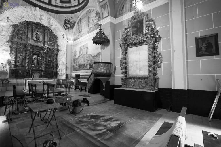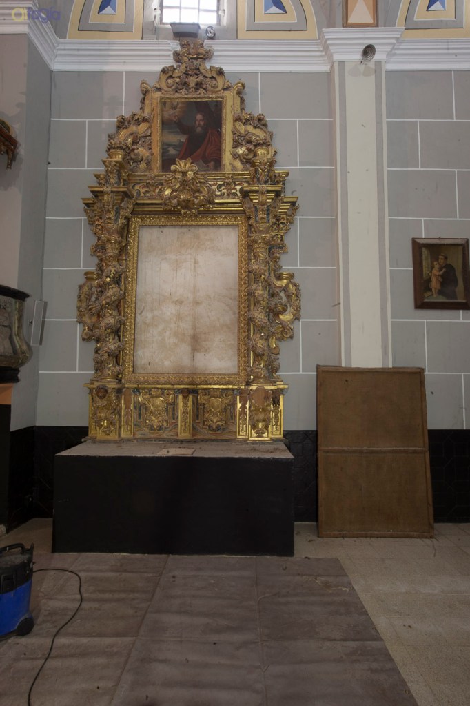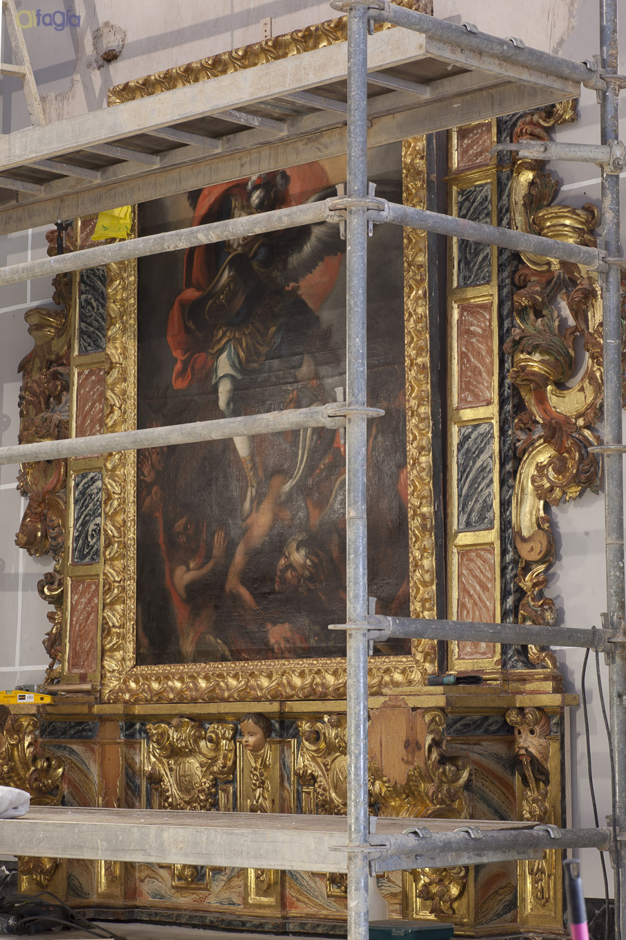 Desmontamos el lienzo central con la escena de San Miguel venciendo al diablo. Contra todo pronóstico, el lienzo sale antes que el marco. El marco, debido a su envergadura, no se desmonta hasta jueves. Desde el andamio segregamos la macolla situada en el centro del entablamento, lo que permite extraer el marco. Curiosamente resulta ser un elemento independiente del entallado.