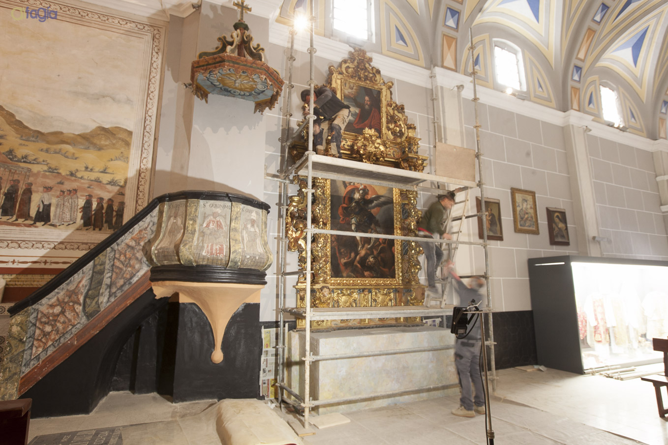 Una semana después de comunicarnos la adjudicación, el ayuntamiento inicia el procedimiento de firma del contrato para restaurar el retablo, sin imaginar, suponemos, la importancia de san Miguel para Alfagía. El primer retablo que restauramos, hace ya treinta años, tenía su advocación. Desde entonces, en otras cuatro ocasiones nos hemos reencontrado con el arcángel, imperturbable, batiendo su espada contra el furor.