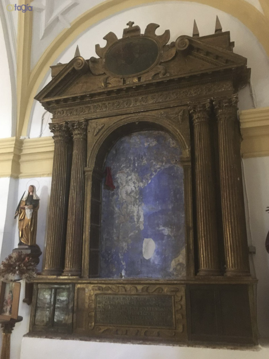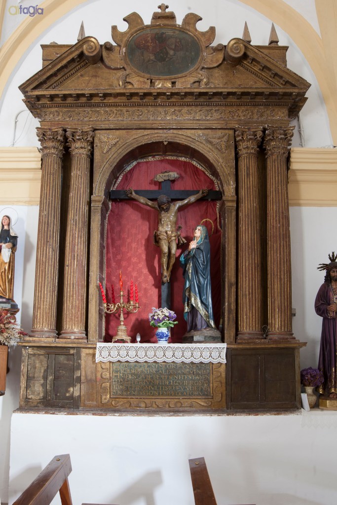 Años despues, en el inventario de 1717, es cuando se realiza la primera mención al retablo: Al lado del evangelio fuera de la capilla mayor ay un retablo antiguo dorado esta vaziada la pintura de Santiago que esta embutido y tiene en medio a Cristo en la cruz.