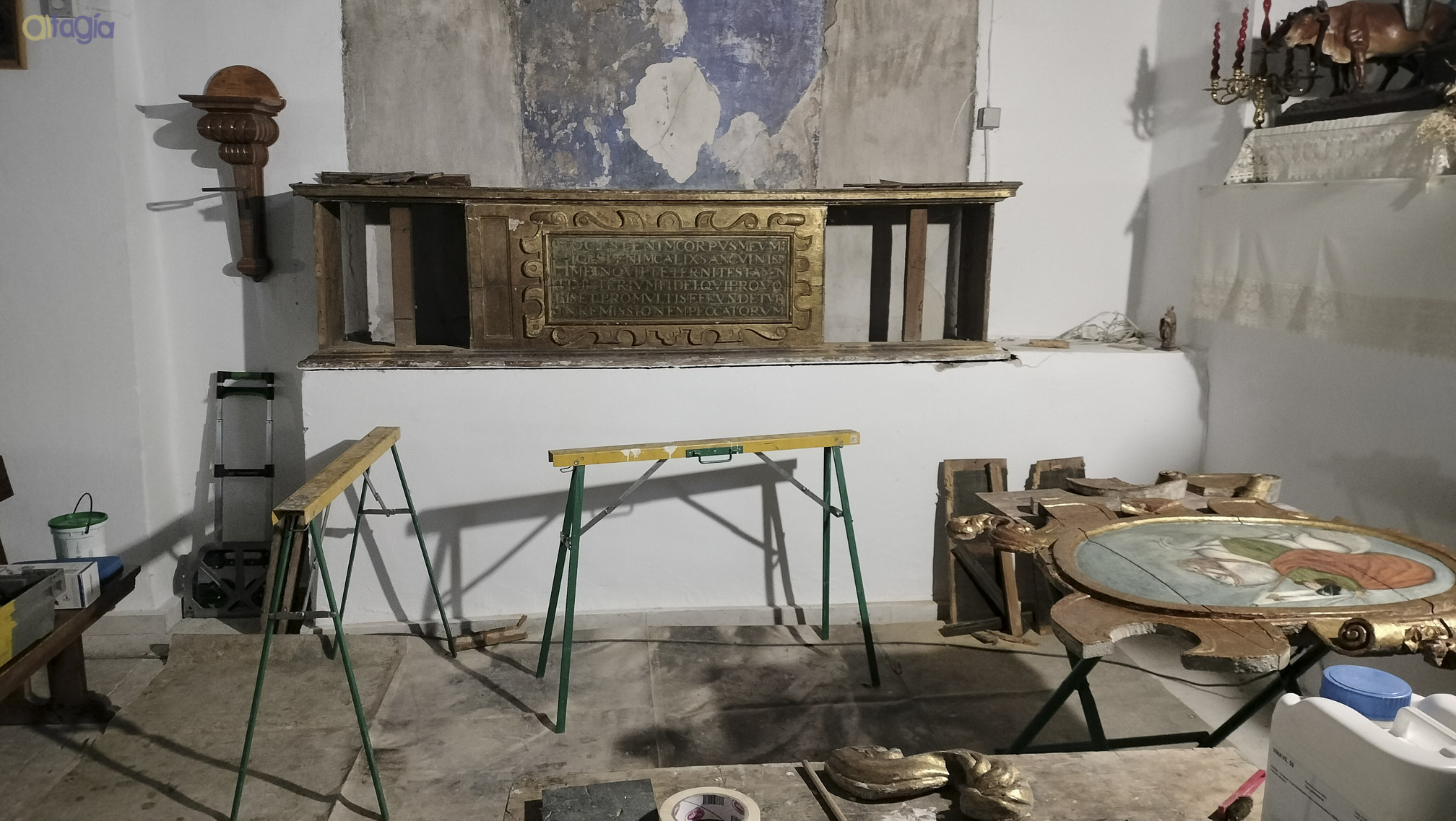 El martes día 2 iniciamos los trabajos de restauración del retablo. Comenzamos situando el taller y retirando los elementos tallados del retablo. Se han realizado distintas catas en la escultura del Crucificado para determinar la morfología de la policromía.