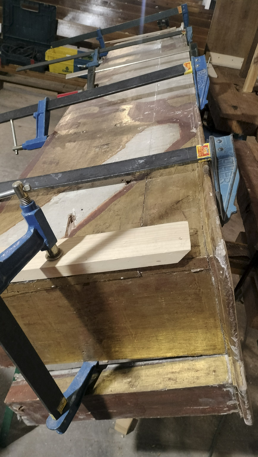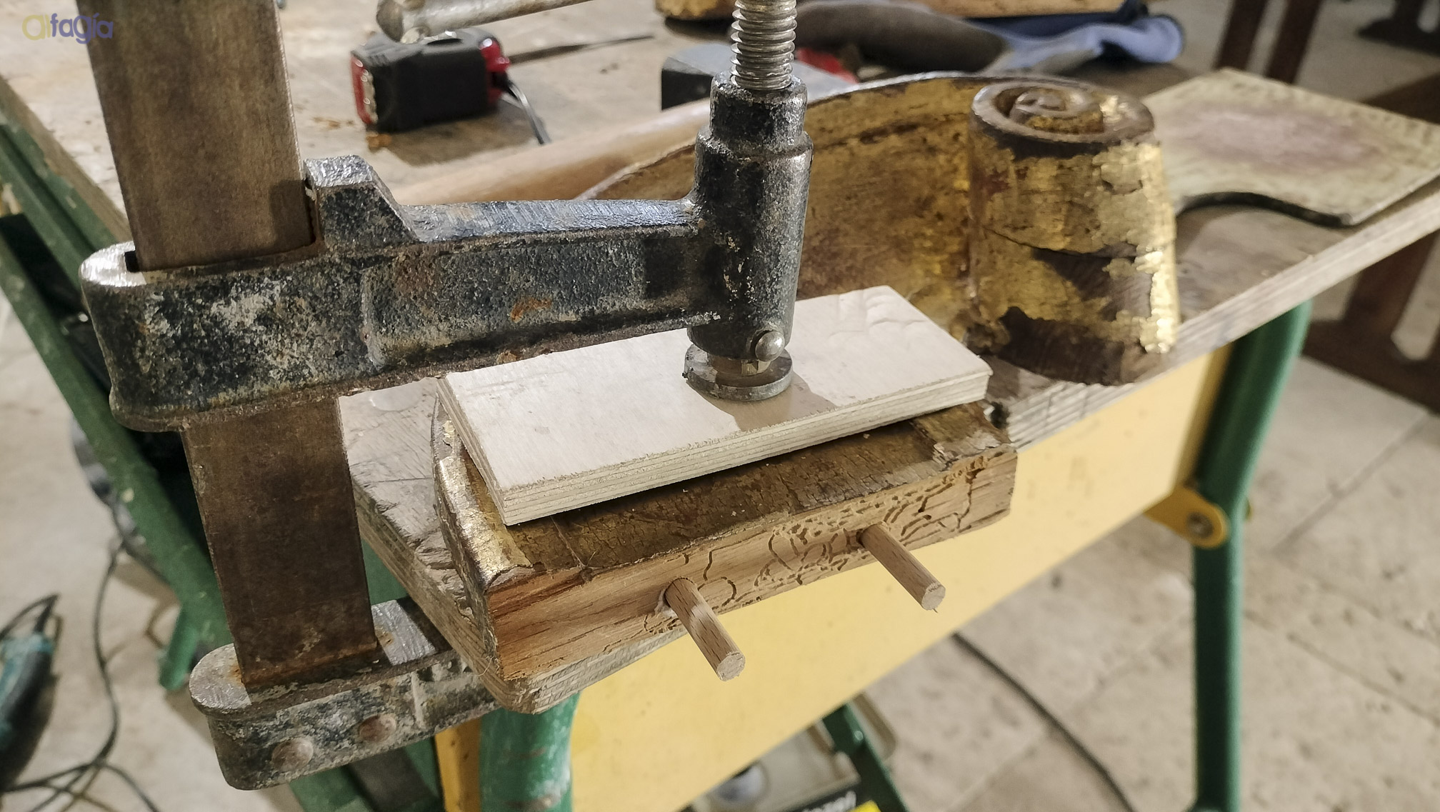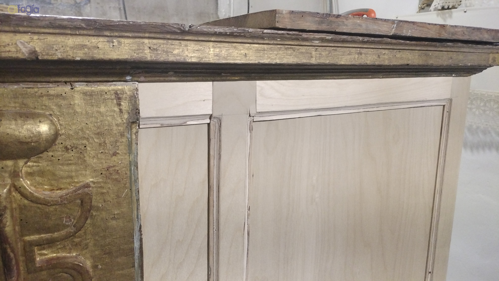 En la predela, hemos comenzado a montar los paneles que forman el frontal. Además de la cartela central y las piezas originales de los laterales, se compeltan las partes perdidas siguiendo los volúmenes que podemos reconstruir con los datos que actualmente observamos en las partes originales. Toda la carpintería nueva se está realizando con madera microlaminada debido a su mayor estabilidad.