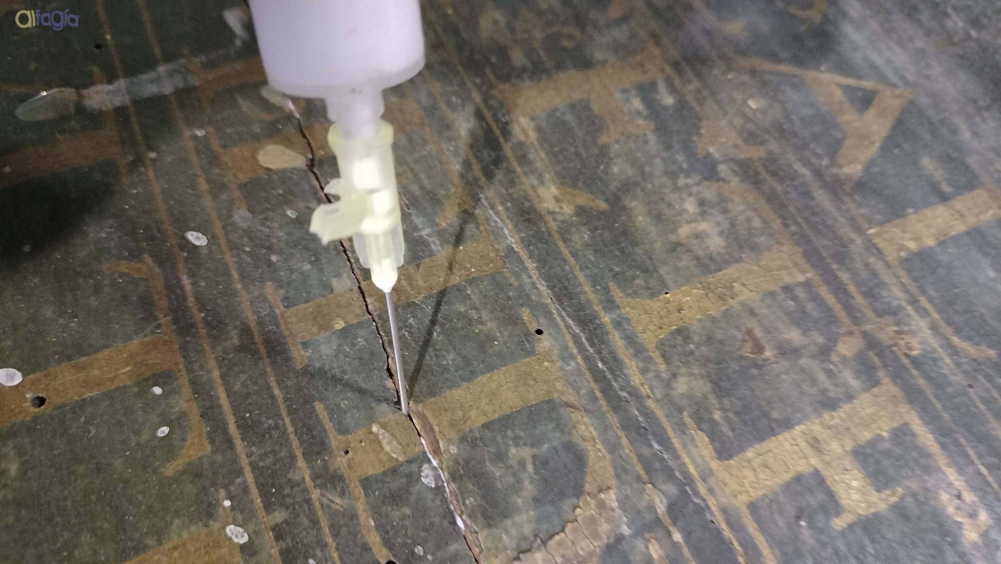 El tratamiento para adherir nuevamente el estrato pictórico al soporte resulta visualmente uno de los más llamativos e identificativos de la restauración. La protección mediante empapelado de la película pictórica se realiza para no perder “ni un trocito de pintura” durante una intervención artesanal donde se regenera la capacidad de adhesión de la capa de color al soporte lígneo del entallado.