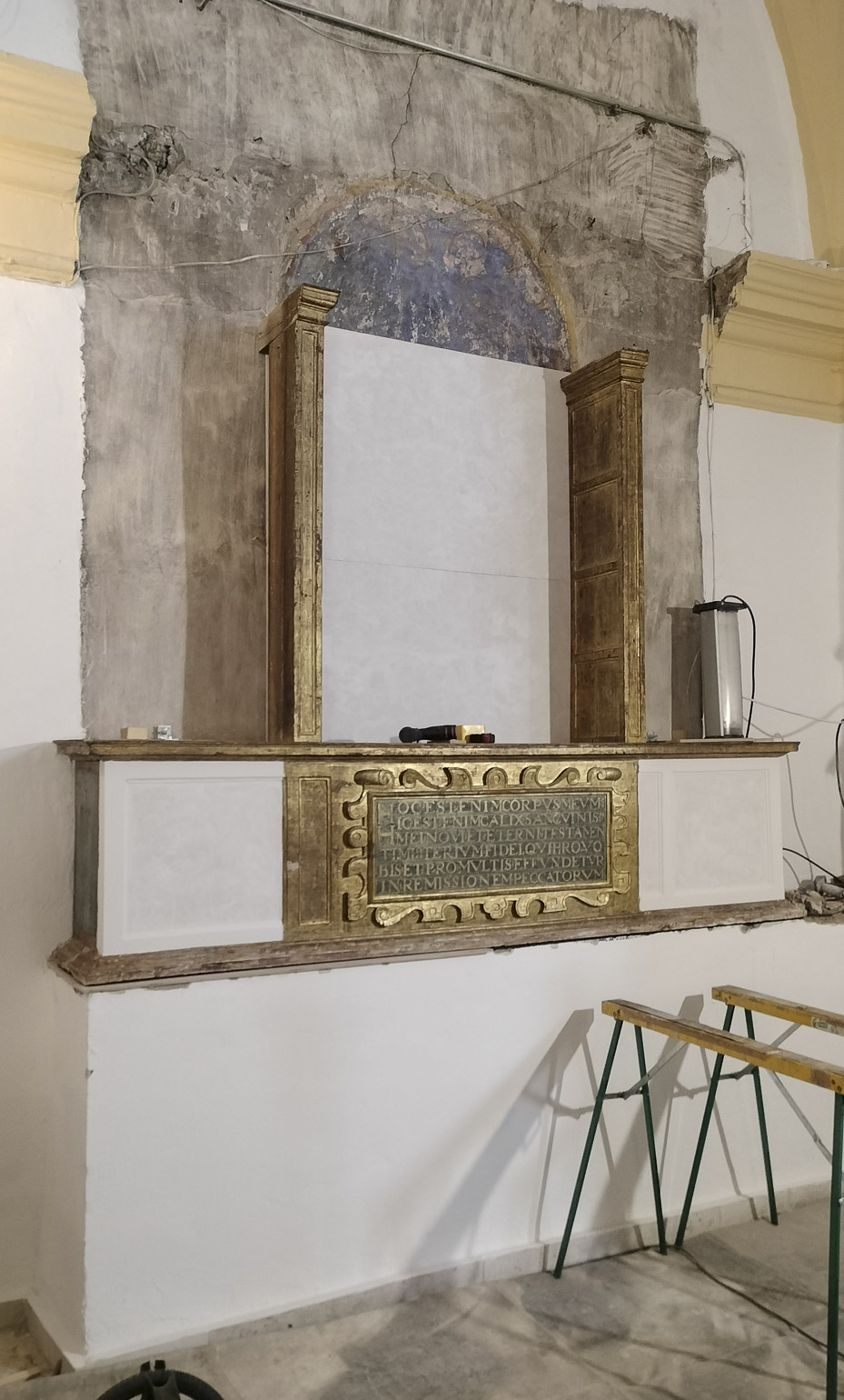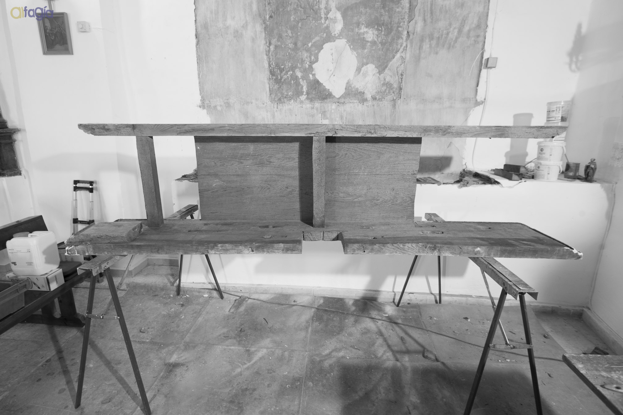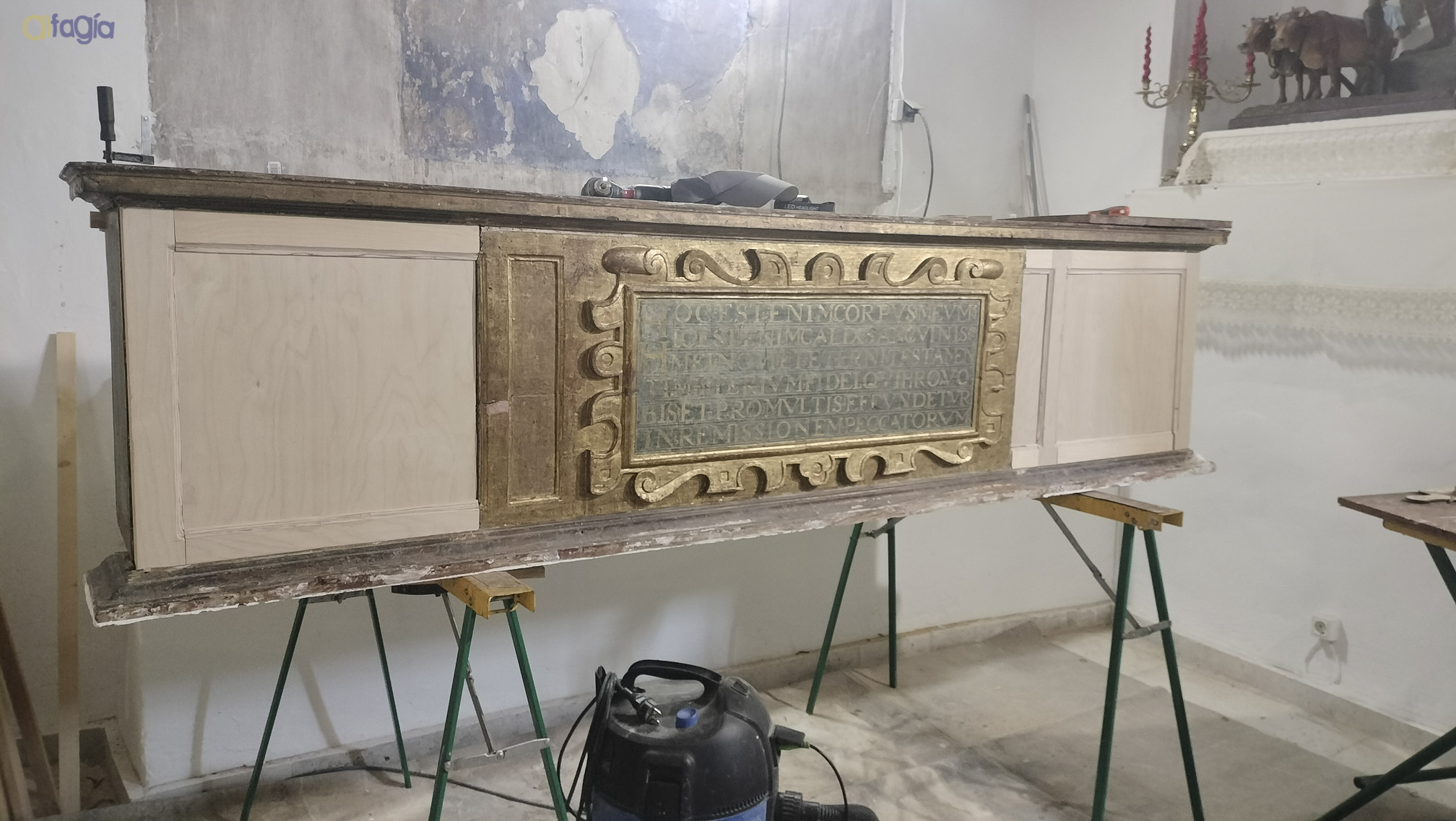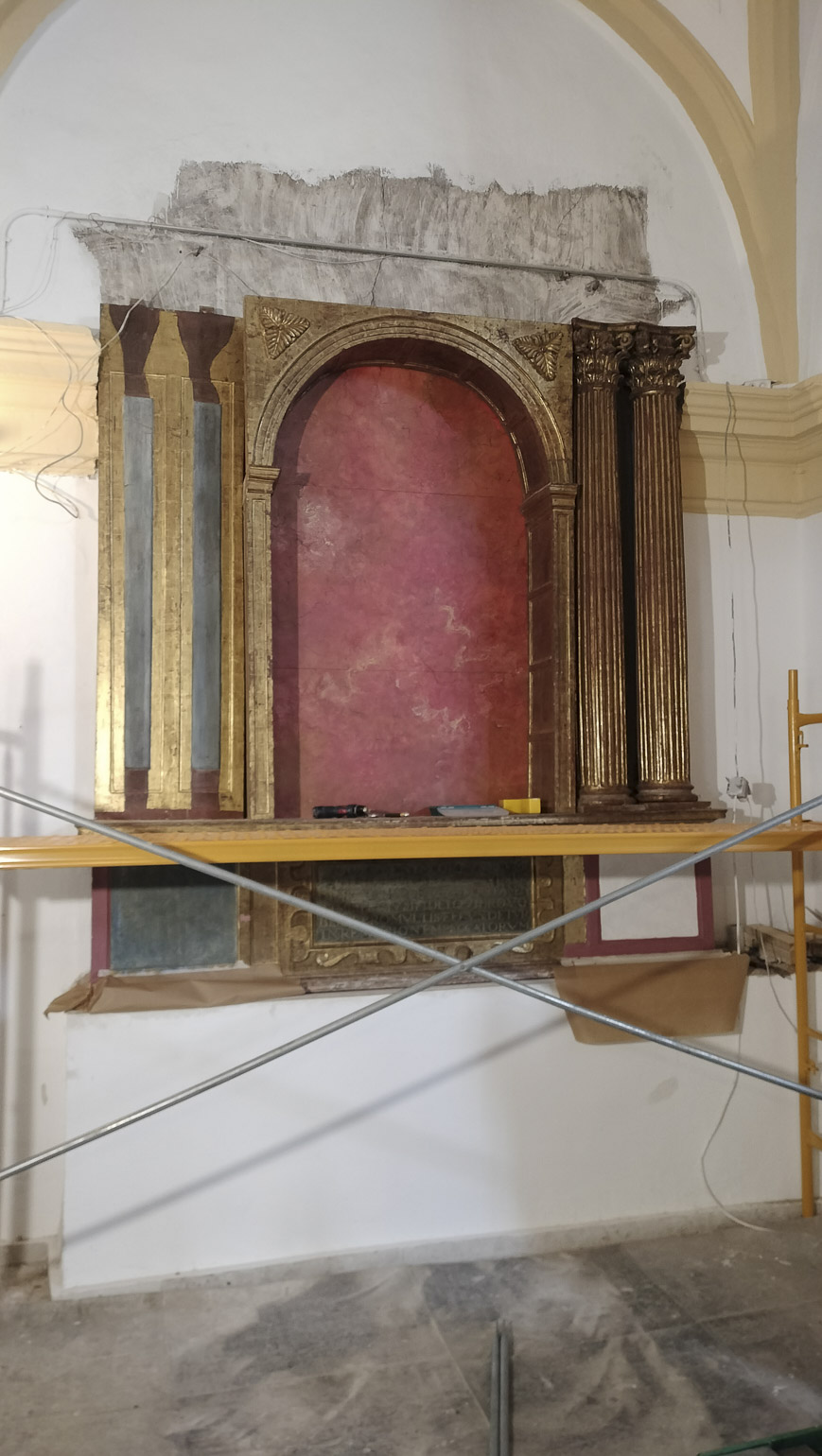 La consolidación y refuerzos de carpintería realizados en el banco permiten disponer esta pieza monumental en su situación original. En el exterior, las piezas de nueva carpintería adaptadas a la distribución primitiva, se han estucado preparándose para los acabados finales. Antes de su montaje se han dispuesto una serie de barreras para contener la humedad y evitar el contacto directo entre el material de obra y la carpintería del retablo.