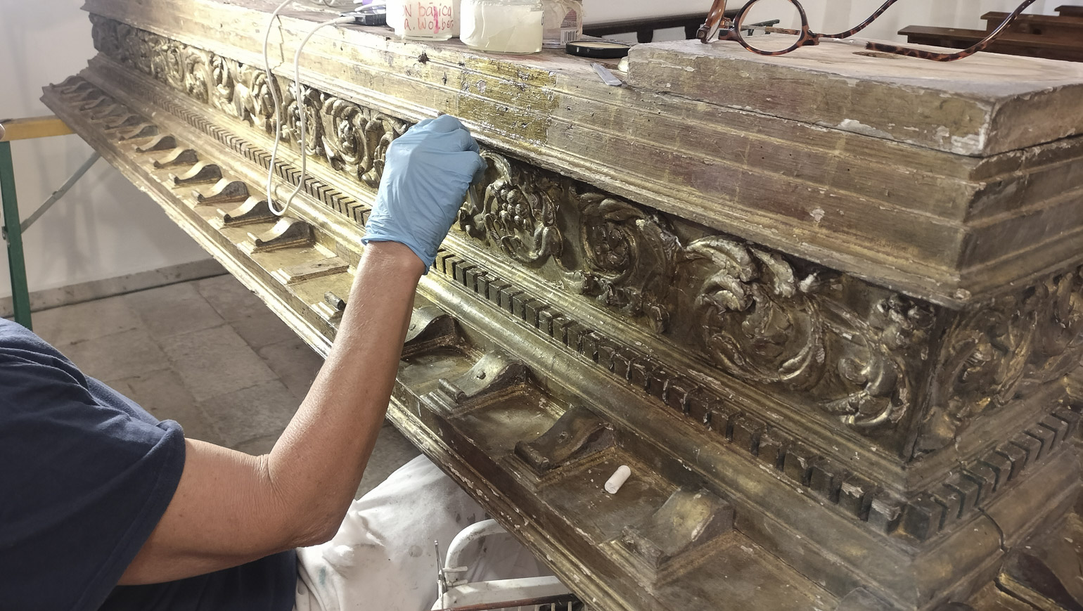 Durante el tratamiento, cada pieza del entallado, cualquier pieza, pasa entre ocho y diez veces por las manos de los restauradores. Cada vez para realizar una acción concreta y precisa. Un tratamiento de restauración consta, por tanto, de numerosas intervenciones definidas y concatenadas. Cada acción precede a la siguiente, y se necesitan periodos de tiempo para permitir el secado, la fijación y el asentado de los estratos asegurando la conservación de la materia sobre la que se interviene. La protección final revela la visión de todos esos meses de trabajo.