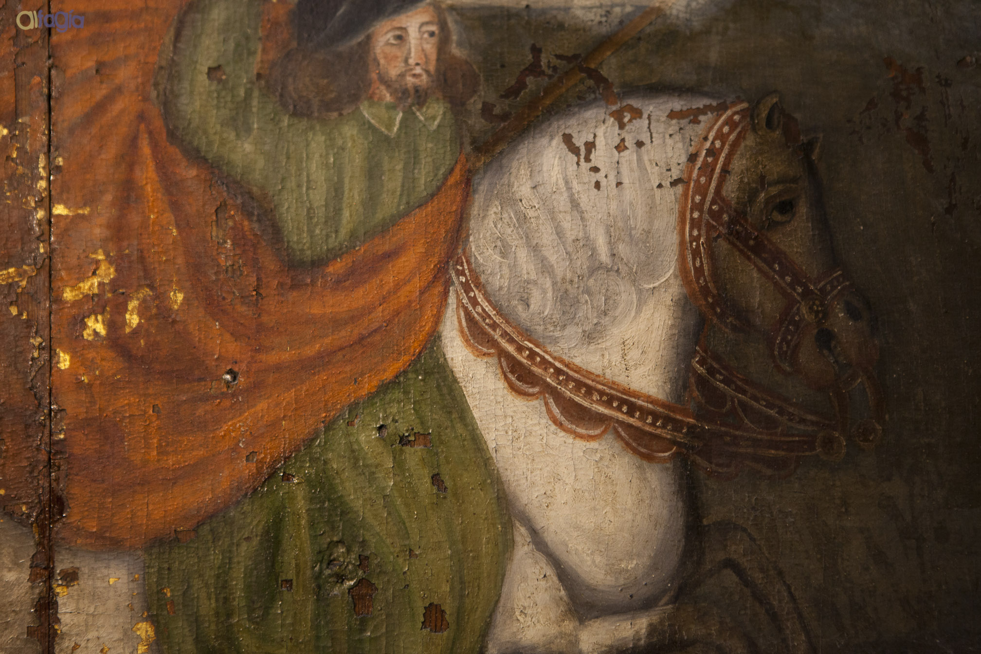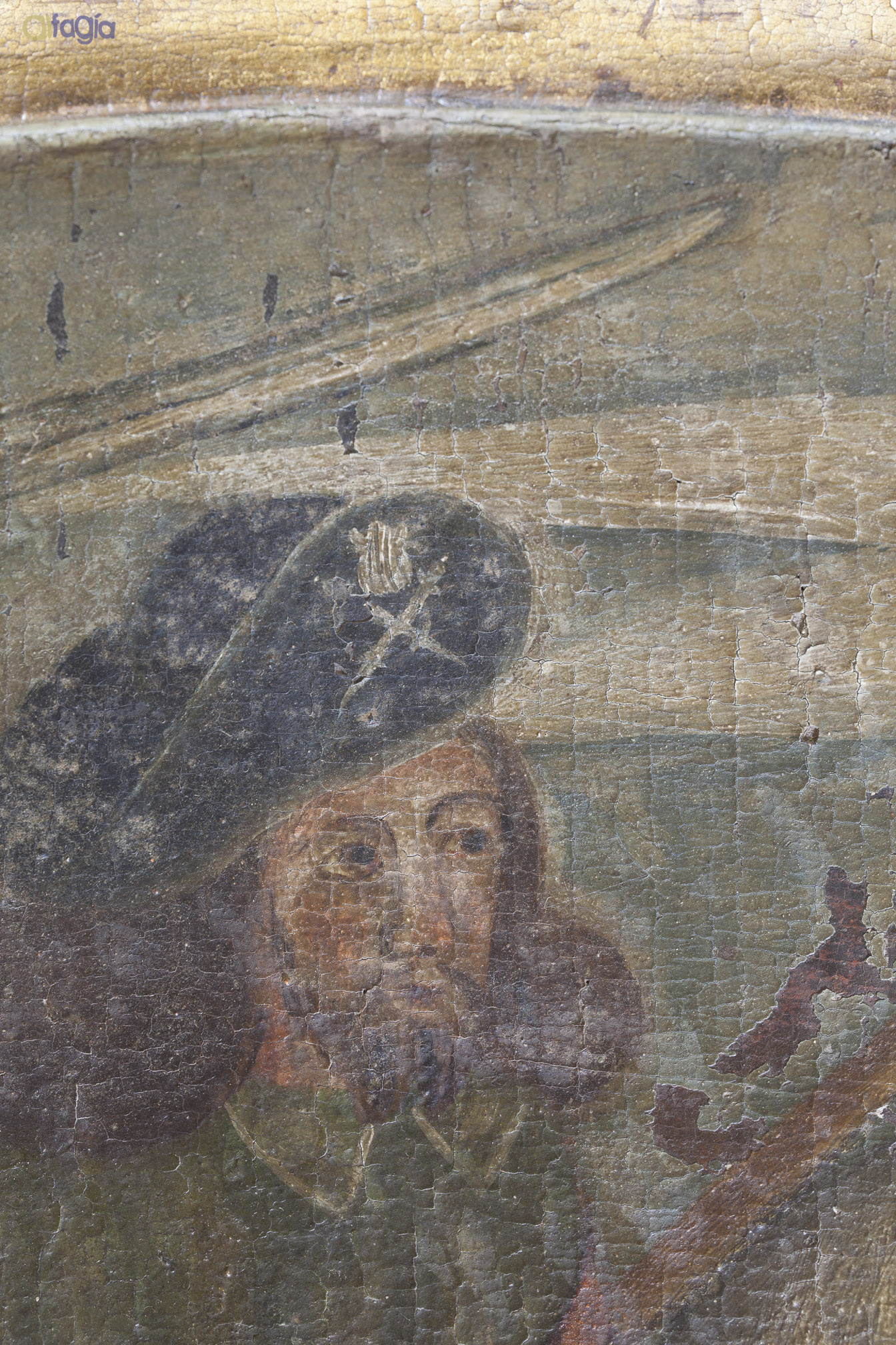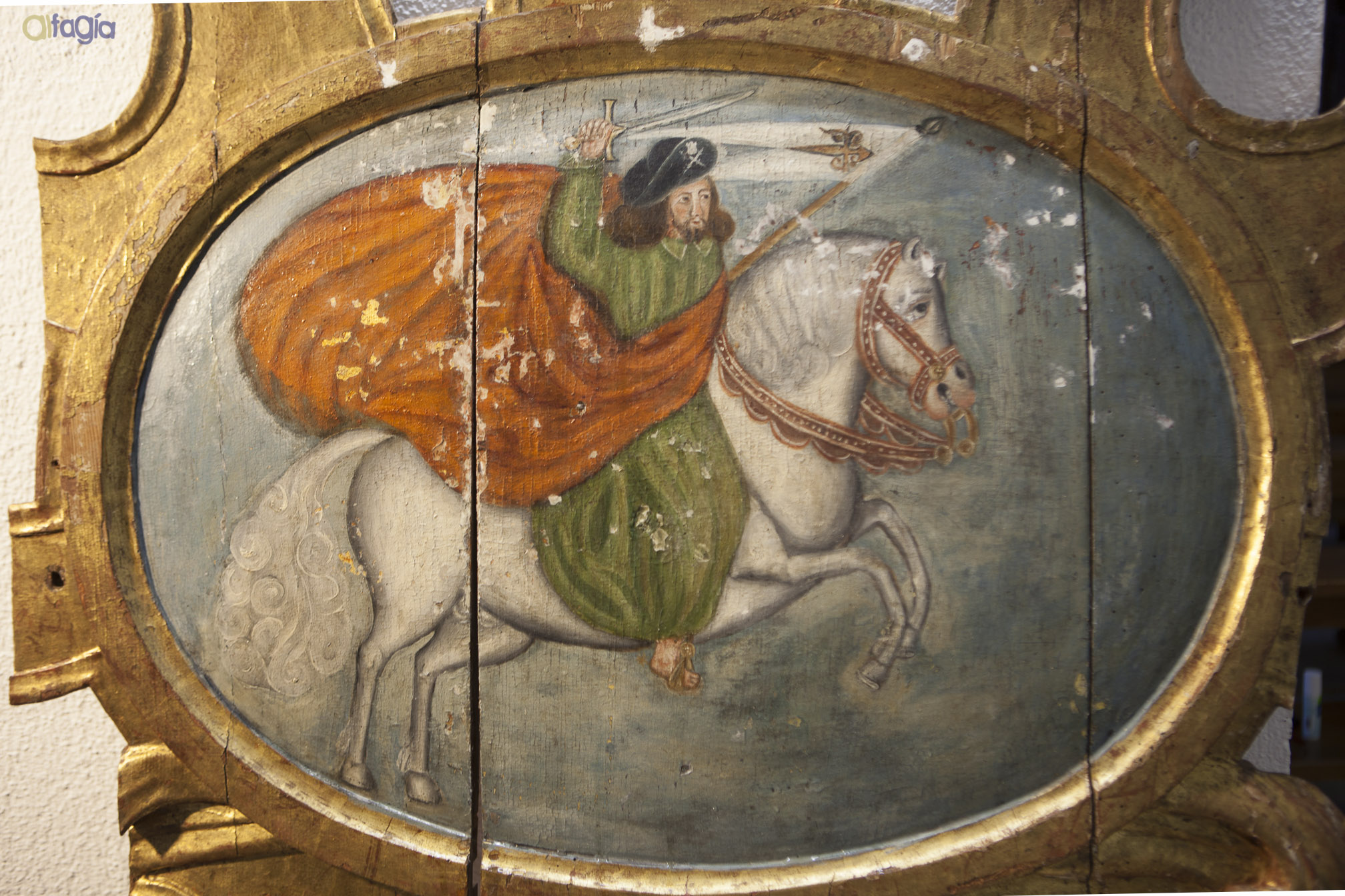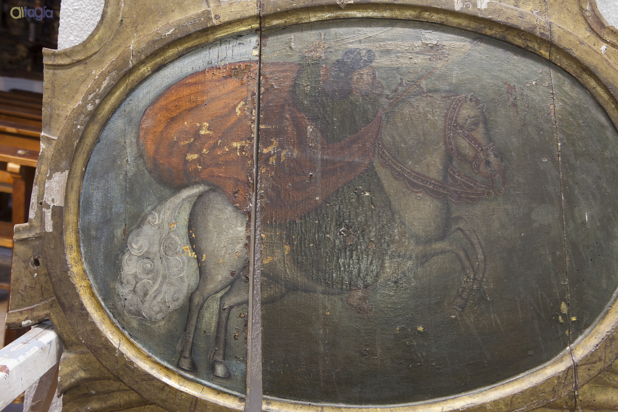 También se ha comenzado la intervención del tondo, la pintura ovalada que representa a Santiago Apóstol, que corona el ático del retablo una vez montado.
