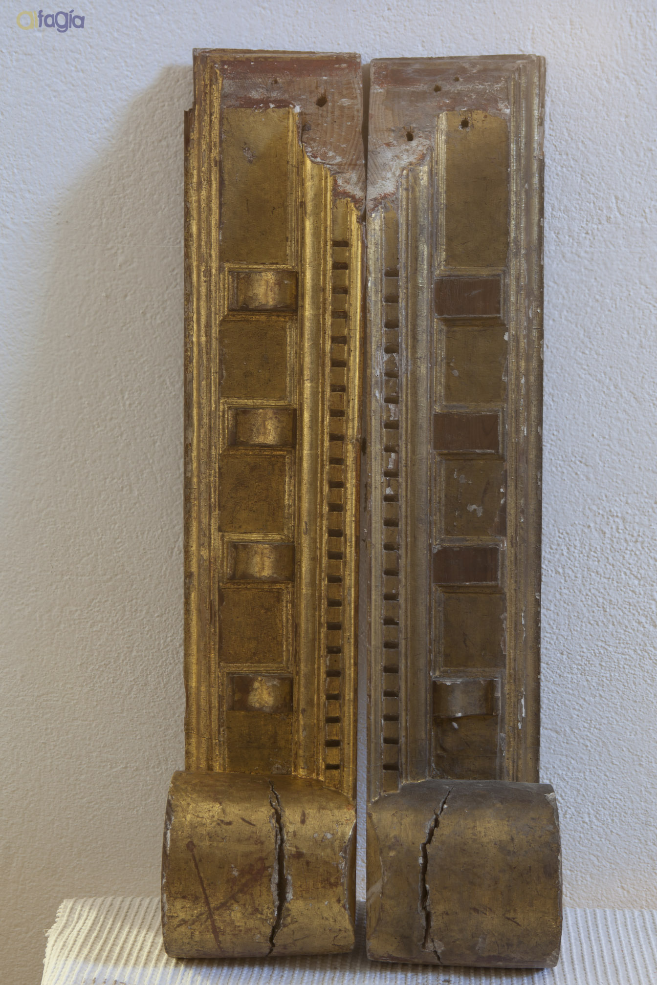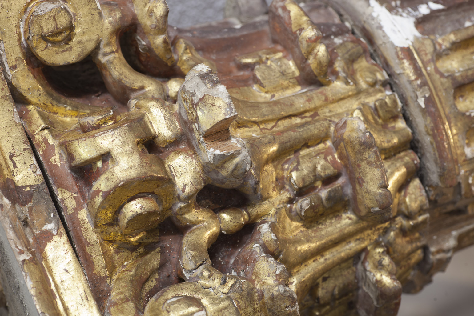 El oro es ciertamente fino, de un amarillo intento, casi anaranjado. Quizás lo es más por un bruñido insistente, o por limpiezas continuadas que erosionan el estrato hasta hacerlo transparente, apenas perceptible por la intensidad del bol rojo. En los capiteles, donde la acumulación de polvo era especialmente llamativa es donde más se evidencia como se recuperan los volúmenes y la intensidad de los acabados metálicos del oro.