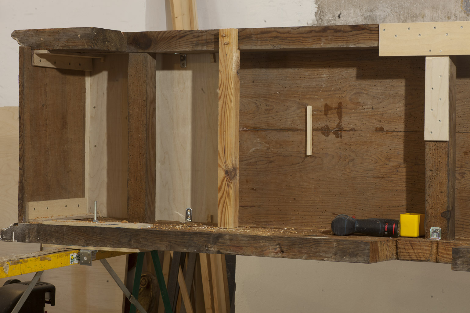 Afortunadamente el miércoles comenzamos el montaje del retablo. La semana anterior habíamos dispuesto sobre la bancada el sistema de aislamiento de la humedad y la base del retablo. Así que, una vez que nos trajeron el andamiaje, comenzamos a situar el entallado del primer cuerpo sobre el mismo. Antes de elevar el entablamento pudimos corregir el desvío o inclinación inicial que presentaba el retablo. Al menos esto era parcialmente posible, pues la deformación que las piezas presentaban tras siglos en esa posición, resultaban incorregibles, pues la madera había ido secando y flexionando en esa posición.