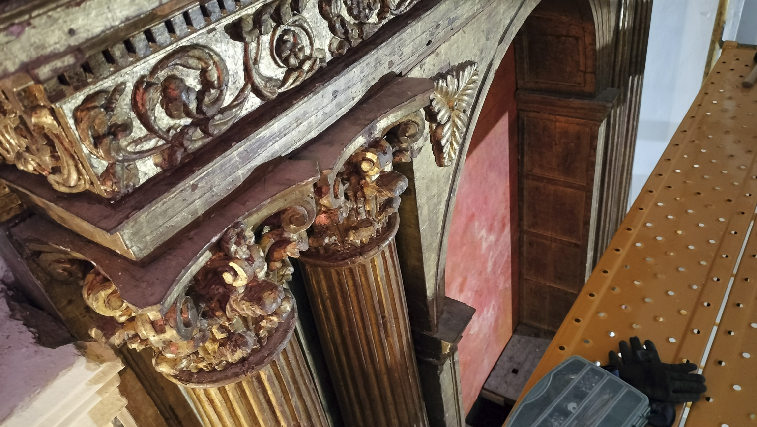 Con el entallado ya dispuesto en su situación, fuimos realizando las piezas perdidas, que habían quedado si reponer hasta el último momento. Hemos realizado un meticuloso registro del material que almacena la iglesia en sus dependencias, incluida la casa parroquial, donde también se almacenan algunos elementos. Sin embargo, no pudimos localizar las partes desprendidas del ático, realizándolas de nueva carpintería.
