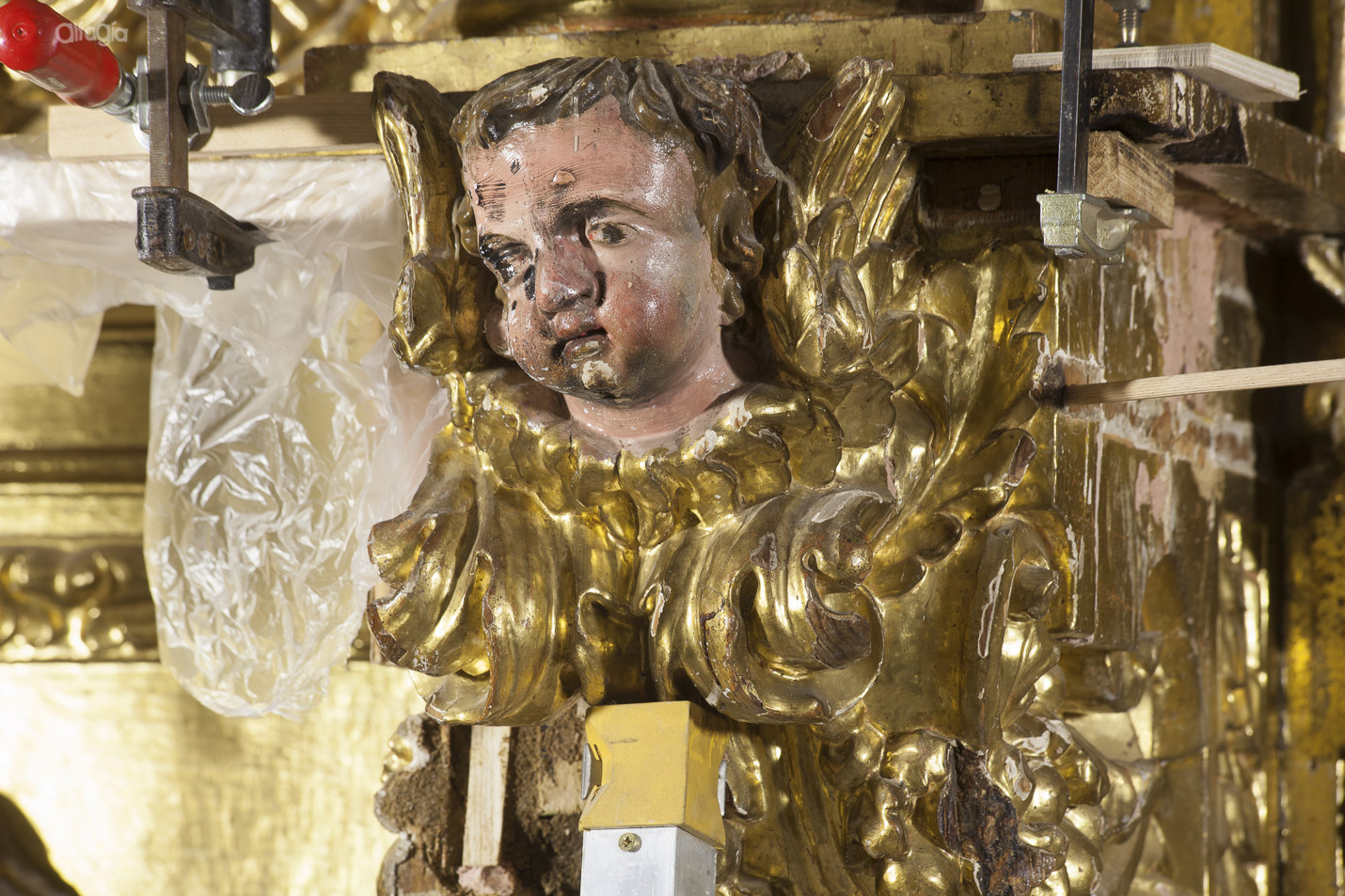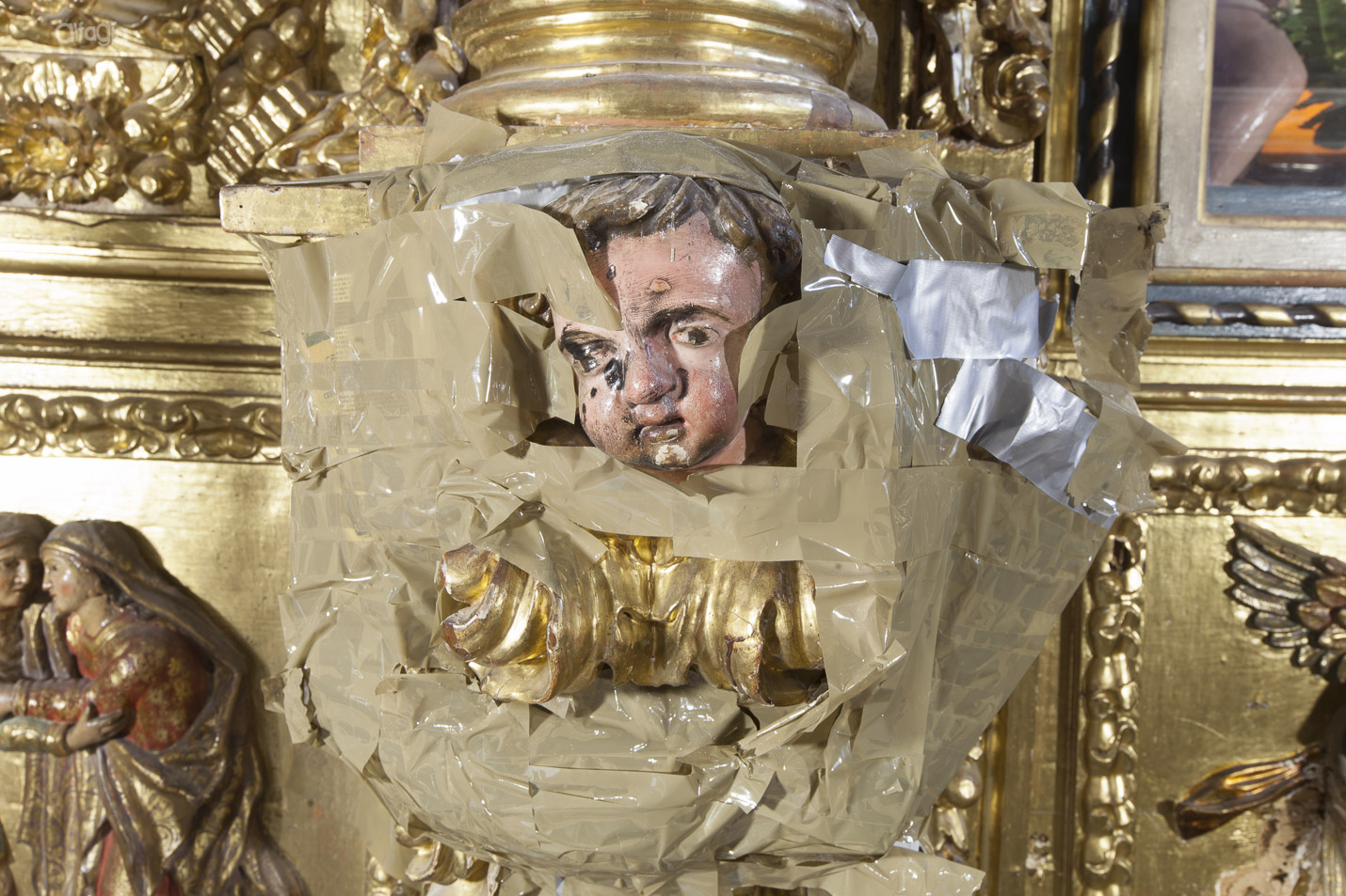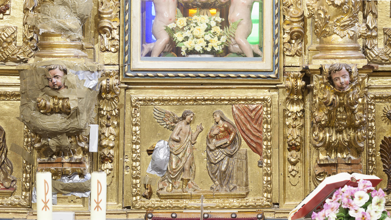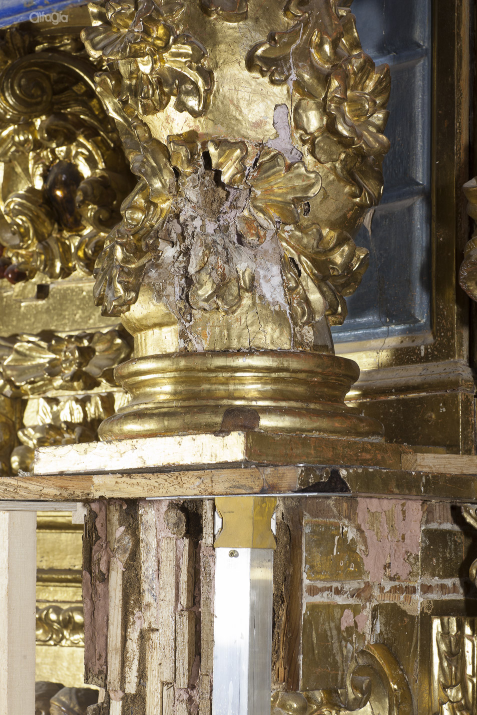 Cuando uno accede por primera vez a la capilla donde se encuentra el retablo, casi de inmediato, llama la atención el brillo deslumbrante de la superficie dorada del retablo, tan completa. Es necesaria una mirada más atenta para identificar las lesiones que aparecen lentamente bajo el oro. Parecen concentrarse en la parte inferior de la carpintería. El sotobanco, igualmente realizado en madera, presenta una llamativa modificación en su parte central. Originalmente tendría un altar anexo ajustado a la liturgia del vestus ordo: la misa trentina. Esa pieza se desmontó tras la reforma de Pablo VI, hacia fínales de los años sesenta del pasado siglo, y la nueva carpintería obedece a una producción posterior.