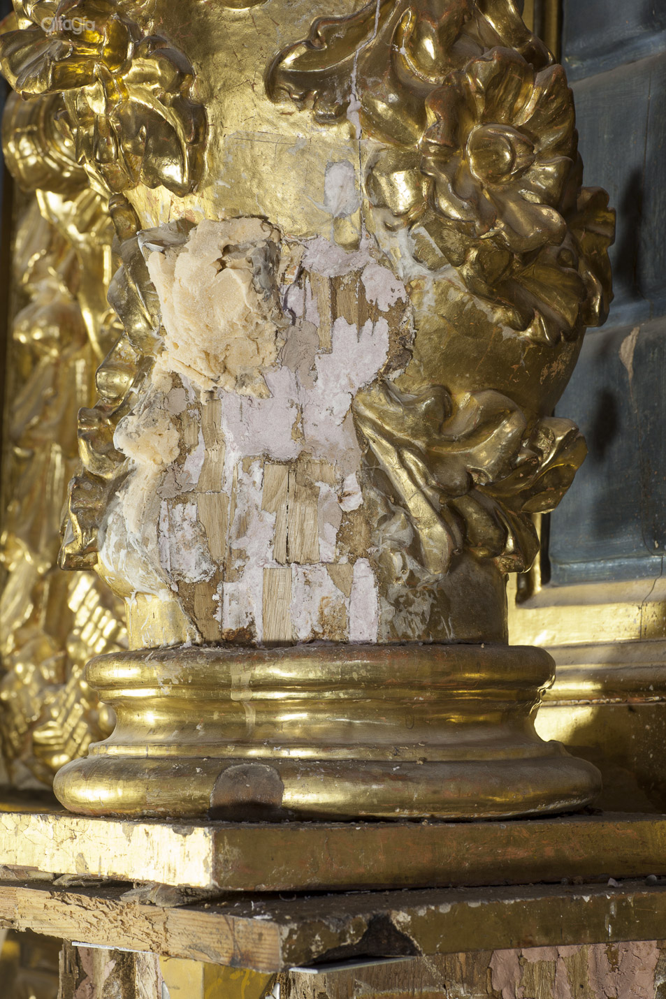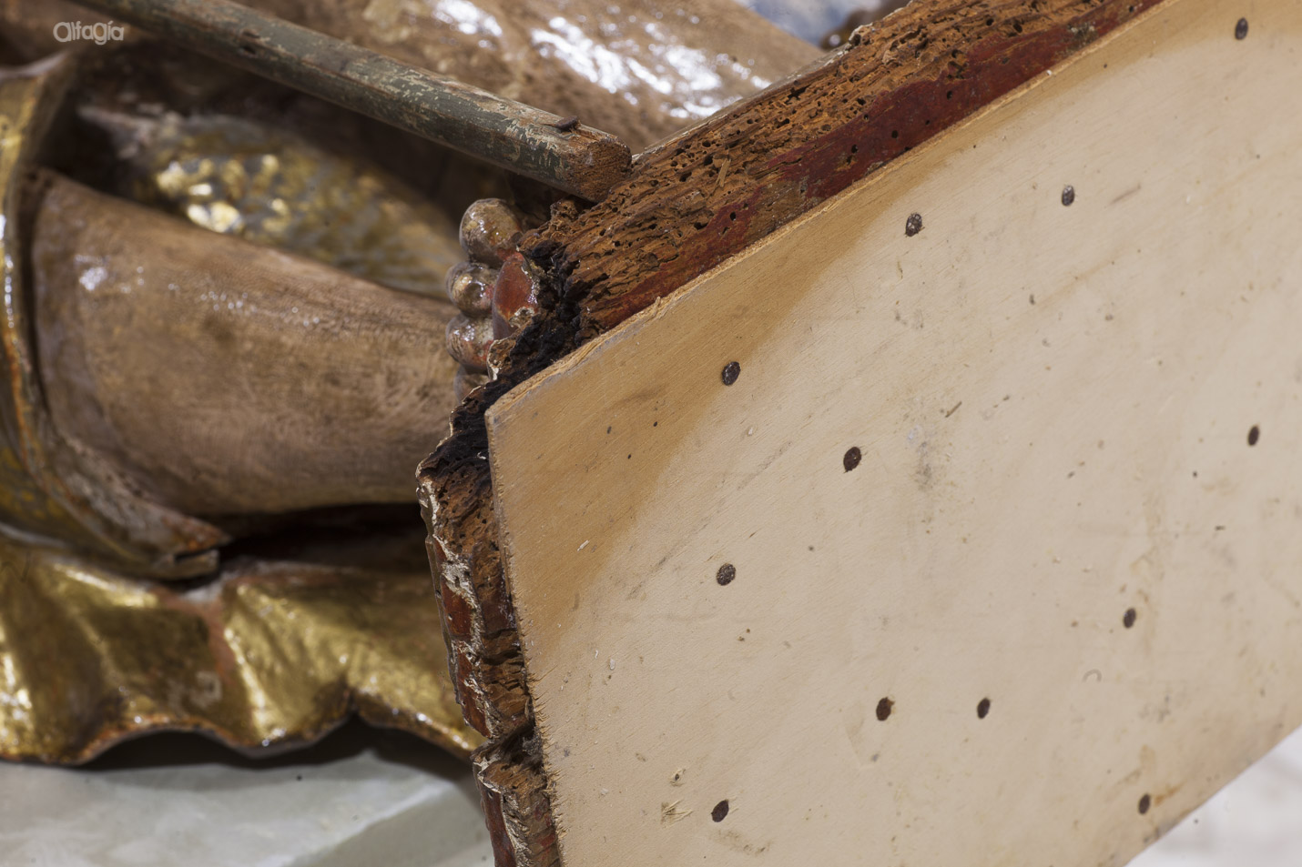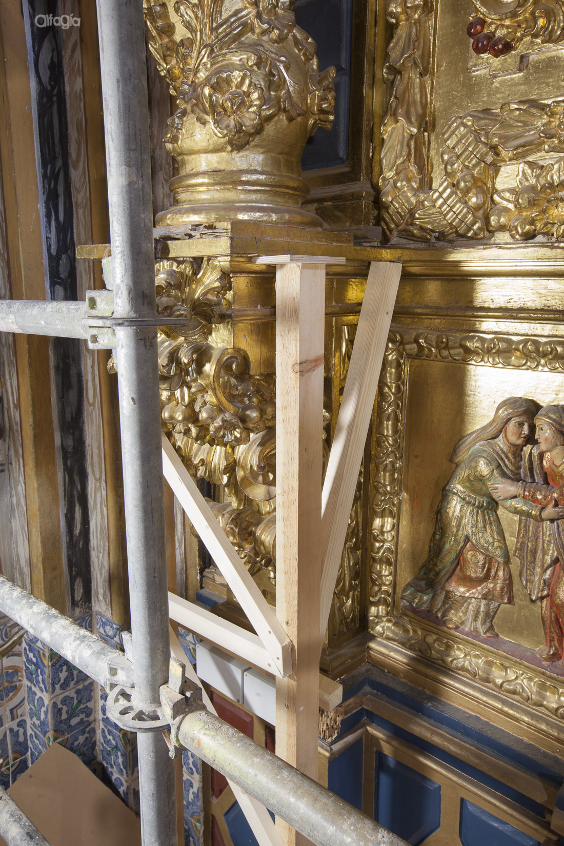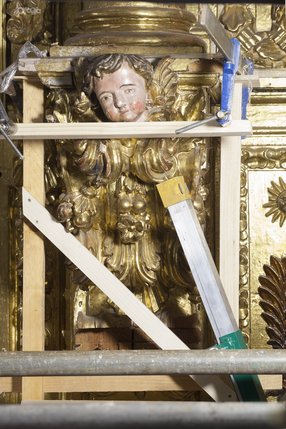 Cuando uno accede por primera vez a la capilla donde se encuentra el retablo, casi de inmediato, llama la atención el brillo deslumbrante de la superficie dorada del retablo, tan completa. Es necesaria una mirada más atenta para identificar las lesiones que aparecen lentamente bajo el oro. Parecen concentrarse en la parte inferior de la carpintería. El sotobanco, igualmente realizado en madera, presenta una llamativa modificación en su parte central. Originalmente tendría un altar anexo ajustado a la liturgia del vestus ordo: la misa trentina. Esa pieza se desmontó tras la reforma de Pablo VI, hacia fínales de los años sesenta del pasado siglo, y la nueva carpintería obedece a una producción posterior.