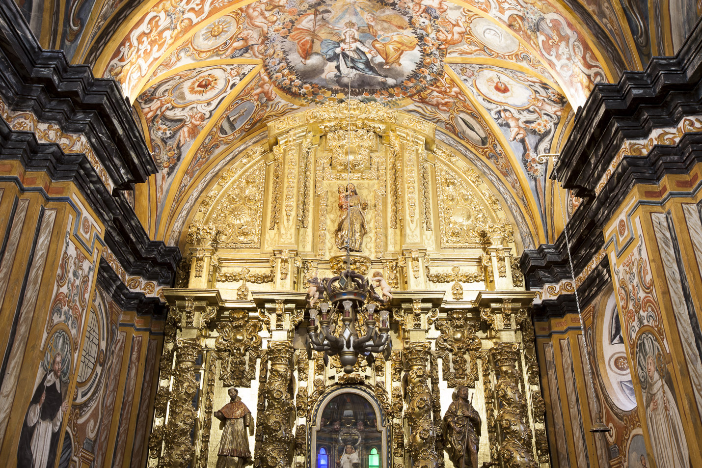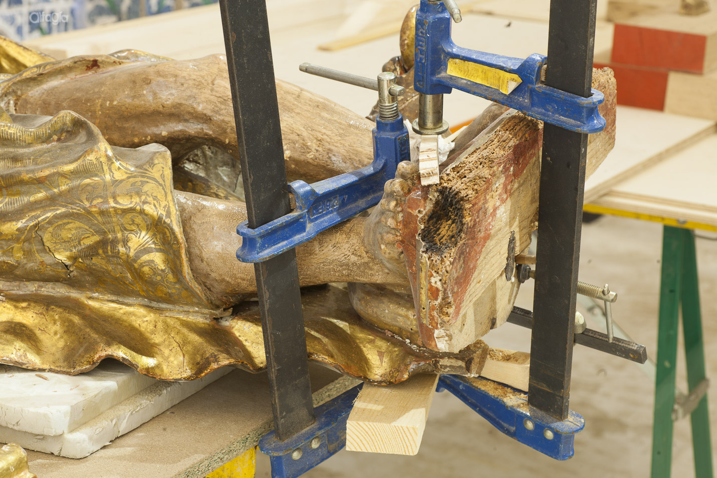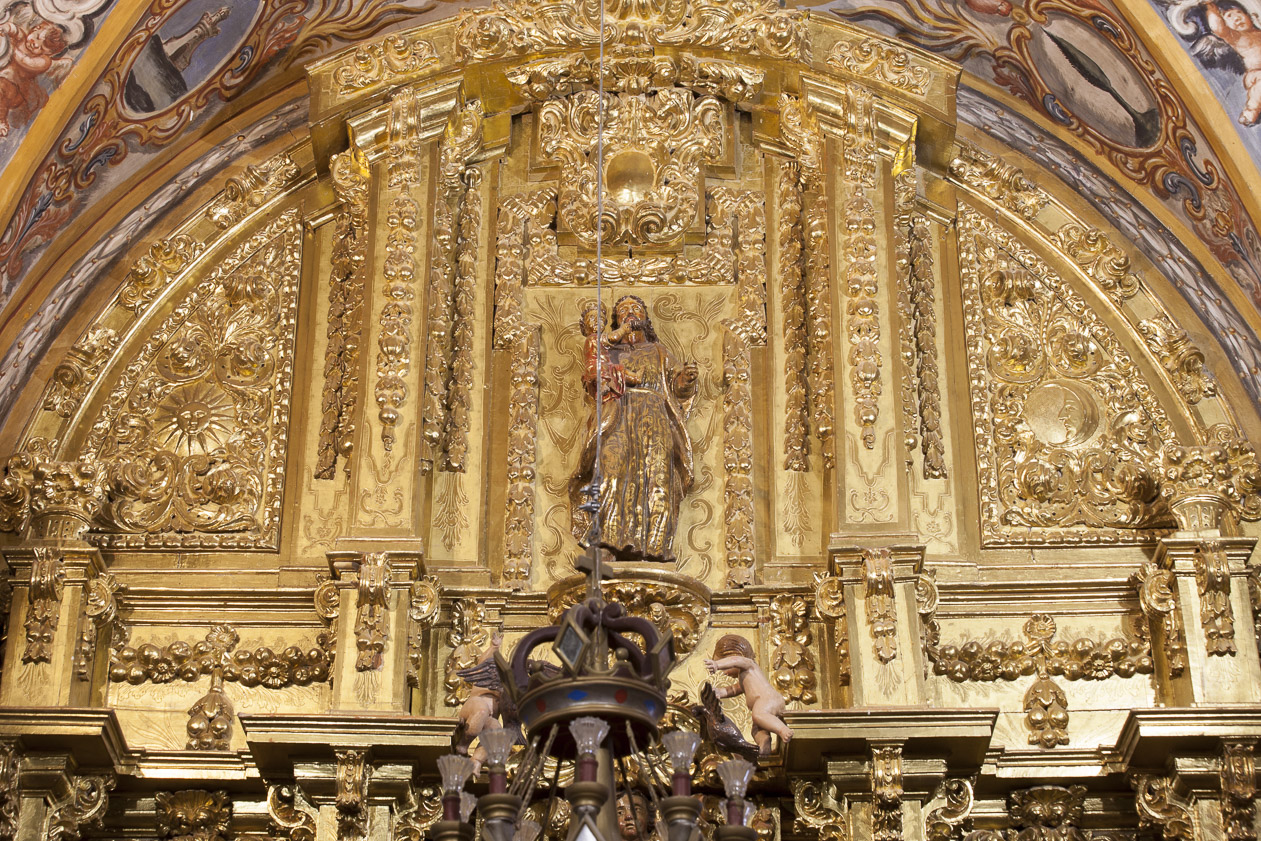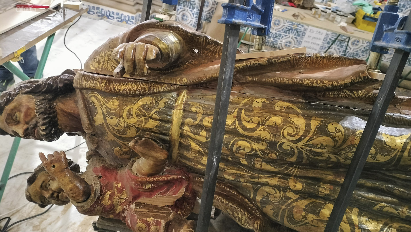 Cuando uno accede por primera vez a la capilla donde se encuentra el retablo, casi de inmediato, llama la atención el brillo deslumbrante de la superficie dorada del retablo, tan completa. Es necesaria una mirada más atenta para identificar las lesiones que aparecen lentamente bajo el oro. Parecen concentrarse en la parte inferior de la carpintería. El sotobanco, igualmente realizado en madera, presenta una llamativa modificación en su parte central. Originalmente tendría un altar anexo ajustado a la liturgia del vestus ordo: la misa trentina. Esa pieza se desmontó tras la reforma de Pablo VI, hacia fínales de los años sesenta del pasado siglo, y la nueva carpintería obedece a una producción posterior.