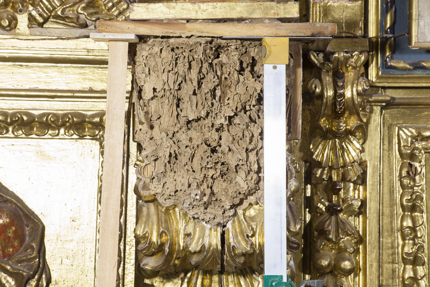 Estos primeros días los hemos dedicado a inspeccionar el retablo. Si sabemos observar, la superficie permite localizar indicios suficientes como para establecer, casi con seguridad, la etiología, el principio que conduce a la aparición de las alteraciones y su evolución. La acción de las terminas es alta, y en la zona inferior, que es donde se dispone el asiento del retablo, su extensión es aún mayor.
